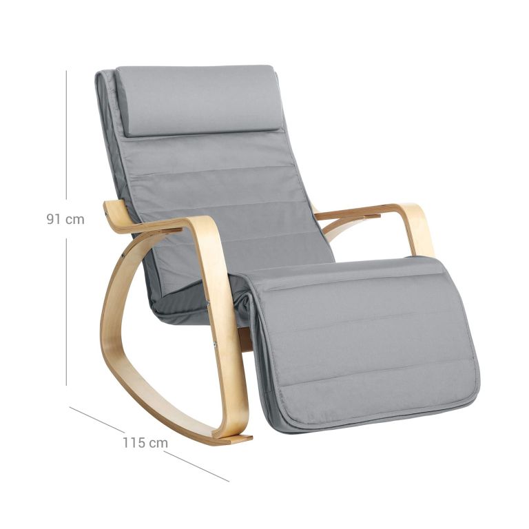 Křeslo má rozměry 55 × 80 × 91 cm a nosnost až 150 kg. Stabilní rám je vyroben z ohýbaného březového dřeva s odolnou povrchovou úpravou. Potah z čisté bavlny je příjemný na dotek, prodyšný a díky zipu snadno odnímatelný a pratelný. Výplň z kvalitní pěny poskytuje pohodlné sezení i při delším používání. Praktická opěrka nohou je nastavitelná do 5 poloh, takže si můžete dopřát pohodlí při čtení, sledování televize i krátkém odpočinku. Součástí je také odnímatelný polštářek pro podporu hlavy a krku.