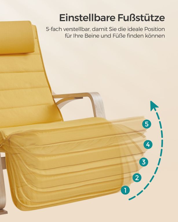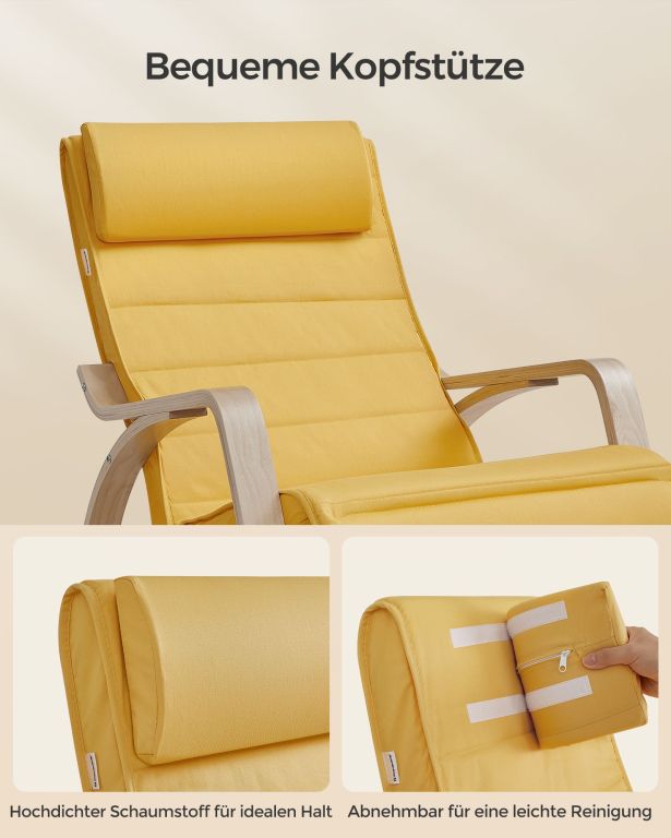 Rozměry křesla jsou 55 × 80 × 91 cm, přičemž robustní konstrukce z ohýbaného březového dřeva bez problémů unese až 150 kg. Potah ze 100% bavlny je prodyšný, příjemný na dotek a díky zipu jej lze snadno sundat a vyprat. Pěnová výplň zaručuje pohodlí i při delším sezení. Praktická opěrka nohou nabízí pět poloh nastavení, takže si vždy najdete ideální pozici pro čtení, sledování oblíbeného filmu nebo krátký odpočinek. Pro ještě větší komfort je součástí odnímatelný polštářek pro podepření hlavy a krku.