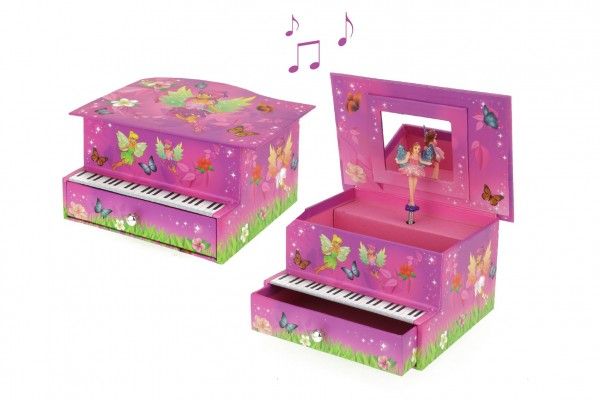 Každá malá parádnice musí mít svoji šperkovnici a tato šperkovnice ve tvaru piána obsahuje přehrádku i volný prostor takže do ní lze snadno srovnat všechny šperky. Na spodní straně víka je zrcadlo, před kterým je víla. Stačí zezadu natočit klíček a víla se točí a hraje líbeznou písničku.