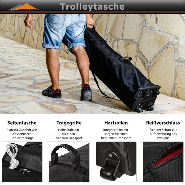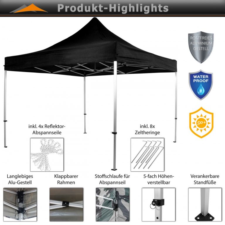 Skládací stan je vysoce kvalitně zpracován. Stan je 100 % funkční - je totiž vodotěsný a díky speciálně impregnované střešní krytině blokuje až 98 % UV slunečního záření. Nerezový rám poskytuje ochranu vůči poškrábání a korozi. Pro další stabilitu a podporu slouží zvětšené nohy konstrukce, extrastabilní spojovací materiál a vysoce kvalitní klikací systém se zajištěním vnějším šroubem s tažným kroužkem. Pro podporu střechy je intergrovaný středový napínací sloupek.