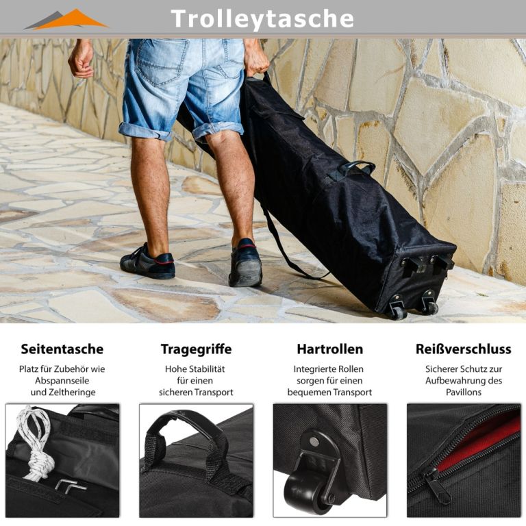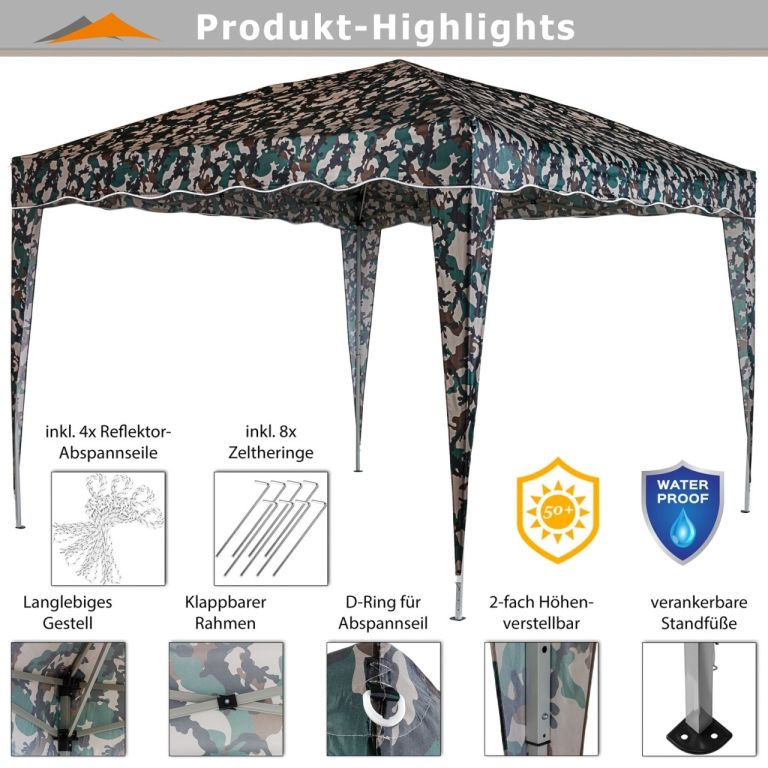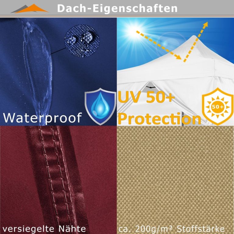 Skládací pavilon Instent Basic 3 x 3 m s výškově nastavitelnými teleskopickými nohami má střechu z polyesteru 200 g/m² s dodatečnou vrstvou PVC. Speciálně impregnovaná střešní tkanina blokuje 98 % slunečního UV záření (UV 50+). Švy altánu jsou utěsněny, k tomuto účelu je na střešní tkaninu tepelně přivařen pás nepromokavé fólie. Náš skládací zahradní altán má lakovaný ocelový rám s nůžkovým systémem. Zahradní stan je k dispozici v různých verzích, bez bočních panelů, se dvěma bočními panely a se čtyřmi bočními panely.