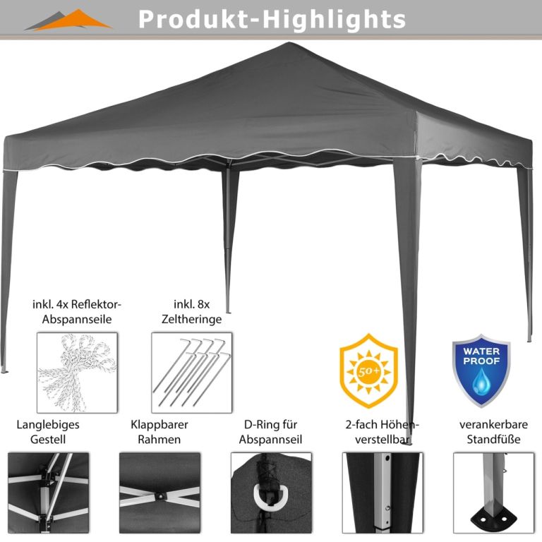 Skládací altán Instent Basic 3 x 3 m s výškově nastavitelnými teleskopickými nohami má střechu z polyesteru 200 g/m² s dodatečnou vrstvou PVC. Speciálně impregnovaná střešní tkanina blokuje 98 % slunečního UV záření (UV 50+). Švy altánu jsou utěsněny, k tomuto účelu je na střešní tkaninu tepelně přivařen pás nepromokavé fólie. Náš skládací zahradní altán má lakovaný ocelový rám s nůžkovým systémem. Zahradní altán je k dispozici v různých verzích, bez bočních panelů, se dvěma bočními panely a se čtyřmi bočními panely.