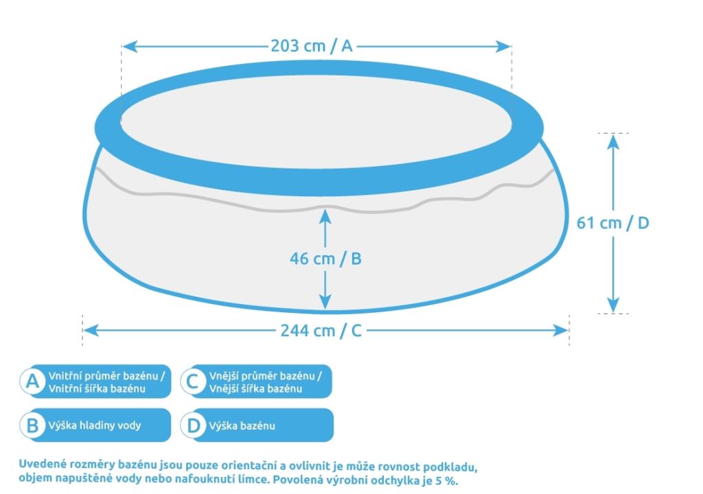 Předností bazénu Tampa je nízká cena, snadná údržba i rychlé zprovoznění. Stačí jen připravit místo na bazén, rozvinout bazénovou podložku, bazén rozbalit, nafouknout horní límec a začít napouštět vodu. Stoupající voda sama bazén postaví. Od vybalení bazénu můžete do 10 minut napouštět vodu. Bazén je nutné po skončení bazénové sezony vyčistit, vypustit a uklidit na suché, nemrznoucí místo. Správnou údržbou prodloužíte životnost bazénu. Doporučujeme bazén po koupání zakrývat krycí plachtou. Pro snadné nafouknutí doporučujeme zakoupit ruční či elektrickou pumpu. Má zpevněné boční stěny 61 cm s trojnásobnou tloušťkou - 3 vrstvy materiálu pro extra pevnost a trvanlivost. K bazénu můžete připojit libovolnou kartušovou či pískovou filtraci z naší nabídky. Pro napojení filtrace jsou připraveny průchody stěnou bazénu o průměru 32 mm (5/4"). Pro připojení pískové či kartušové filtrace je nutné dokoupit: 6 ks bazénových hadic, 2 ks průchodu stěnou bazénu a 1 ks instalační sady. Bazén Tampa není určen k celkovému ani částečnému zapuštění do země. Jedná se o nadzemní bazén. Upozornění: Uvedené rozměry bazénu jsou pouze orientační a ovlivnit je může rovnost podkladu, objem napuštěné vody nebo nafouknutí límce. Povolená výrobní odchylka je 5 %.