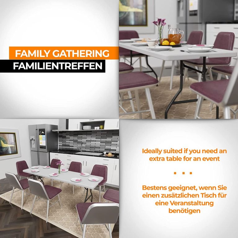 Tento všestranný skládací stůl je ideální pro zahradní párty s přáteli, rodinnou večeři i narozeniny dětí. Díky své velikosti lze bufetový stůl používat venku i uvnitř. Stůl lze snadno složit, takže jej lze snadno skladovat a přepravovat díky integrované rukojeti a nízké hmotnosti. Stabilitu zajišťují robustní nohy s gumovými krytkami. Robustní ocelové nohy a deska stolu z HDPE plastu odolná proti poškrábání s maximální nosností 150 kg dělají z tohoto stolu odolný kus nábytku.