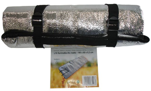 Karimatka ALU matte - 190 x 60 x 0,3 cm. Karimatka je opatřena oboustrannou vrstvou hliníkové folie - proto ALU (Alumatka), která zabraňuje vlhkosti a udržuje tělo v teple tím, že tělesné teplo při ležení na Alumatce odráží zpět.