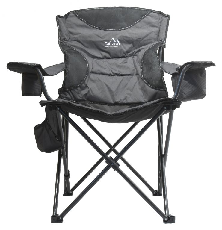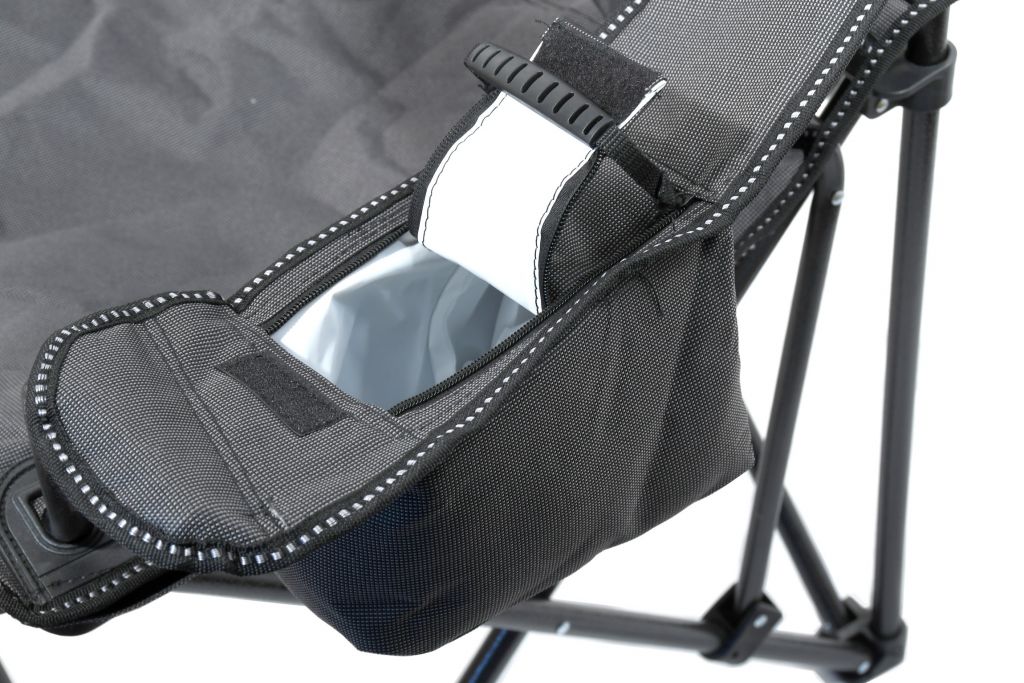 Křeslo je ideálním prostředkem pro pohodlné posezení u vody, v přírodě, ale i odpočinek na zahradě. Je opatřeno kvalitně sešitým potahem a polstrovanými rukojeťmi. Rukojeti jsou doplněny o držák na pití a praktickou brašnu na drobnosti. Nosná konstrukce je dostatečně bytelná.