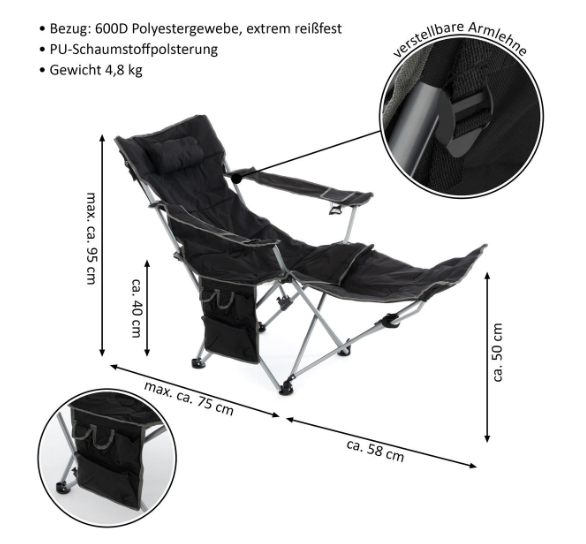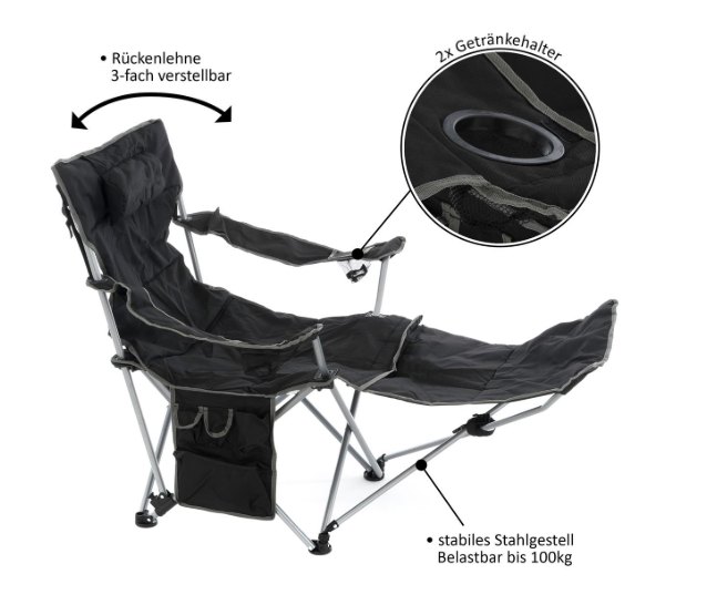 Kempingová židle nebo kempingové lehátko - vyberte si. S touto kempingovou židlí můžete sedět v uvolněné poloze celé hodiny nebo si lehnout a luxusně si odpočinout. Židle je sklopná a snadno přenosná, rychle připravená k použití a stejně rychle znovu zabalená. Díky praktické odolné brašně lze židli vzít kamkoliv. Dva integrované držáky nápojů v područkách skládací židle lze zakrýt, když se nepoužívají, a nabízejí velmi užitečnou možnost uložení nejen plechovek a lahví, ale také příslušenství, jako je např. mobilní telefon. Kromě toho je na boční straně židle praktická úložná kapsa na zip a 3 kapsy. Ideální pro rybaření, kempování, stanování a pikniky, na festivaly, různé akce nebo jednoduše jako pohodlné zahradní židle nebo skládací balkonová židle. Tato židle je také skvělým společníkem na cesty a na dovolené.