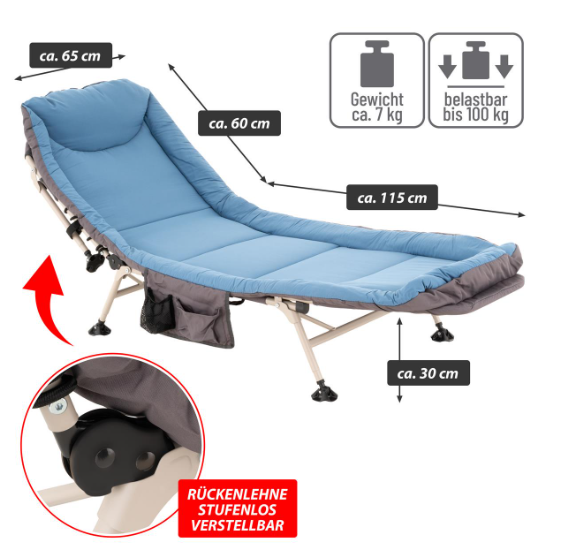 Toto moderní rybářské lehátko ve světle modré/šedé barvě má lehkou ocelovou konstrukci navrženou pro dobrou odolnost a stabilitu a snadnou manipulaci. Opěradlo je plynule nastavitelné pro optimální, relaxační polohu vleže i vsedě. Pro pohodlnou přepravu můžete lehátko Fischer složit. Vybaveno 6 blátovými nožičkami pro bezpečné postavení a pěnovým polstrovaným čelem. Menší předměty lze uložit do boční kapsy připevněné na pravé straně. Lehací plocha ze 100% polyesteru je vodoodpudivá a tepelně izoluje. Všimněte si také našeho dalšího zahradního nábytku, jako jsou skládací židle, stohovací židle, bistro židle, taburety, lavice, stoly ze dřeva nebo kovu, stejně jako slunečníky a stojany na deštníky.