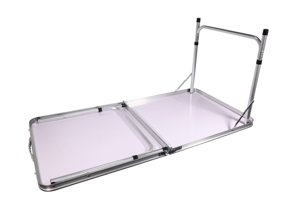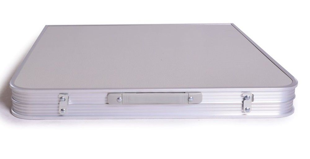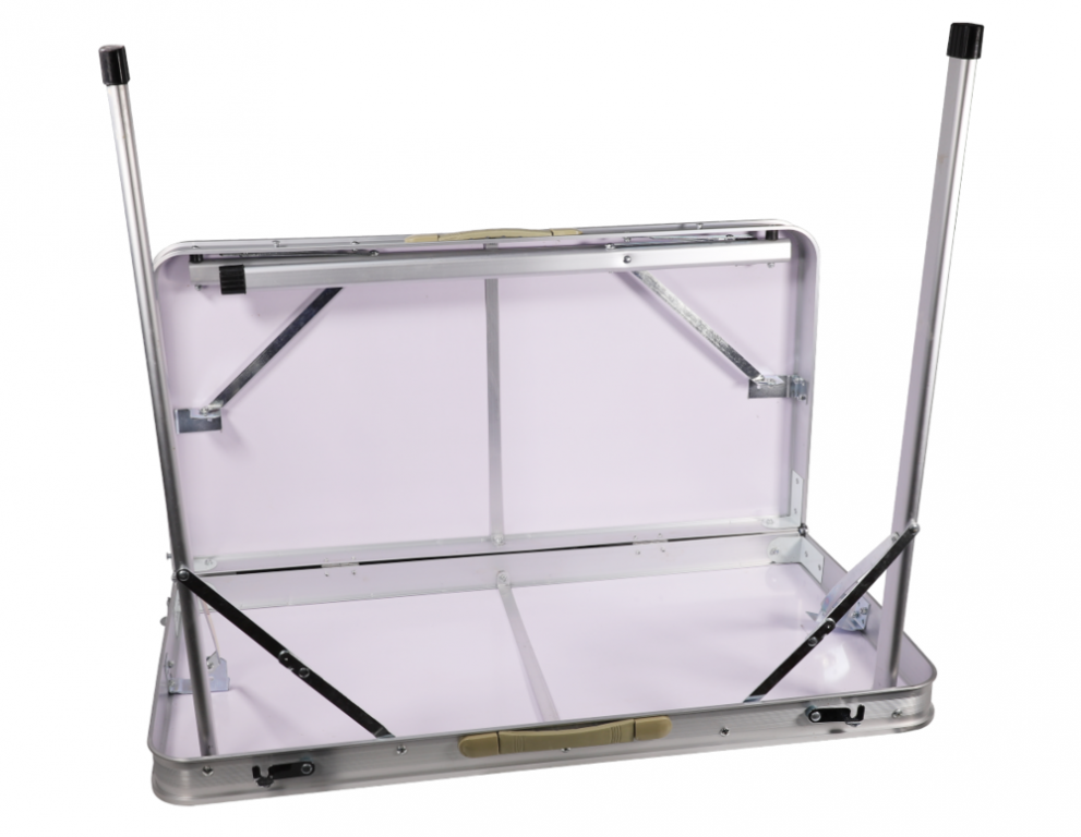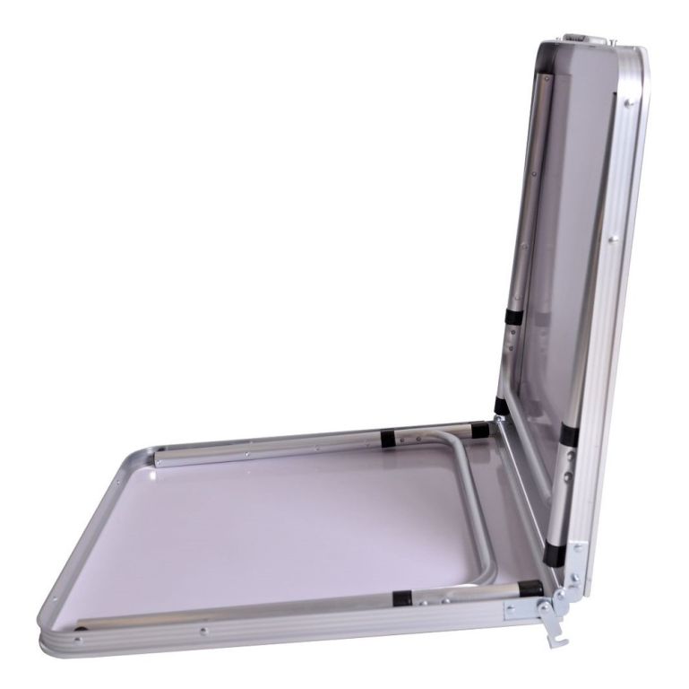 Skládací stůl s deskou ve světle šedé barvě s hliníkovou konstrukcí stříbrné barvy. Je lehký a velmi skladný. Vhodný na rychlé rozložení na zahradě, ale především na kempování.