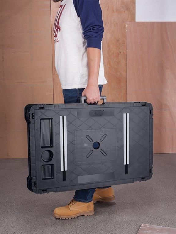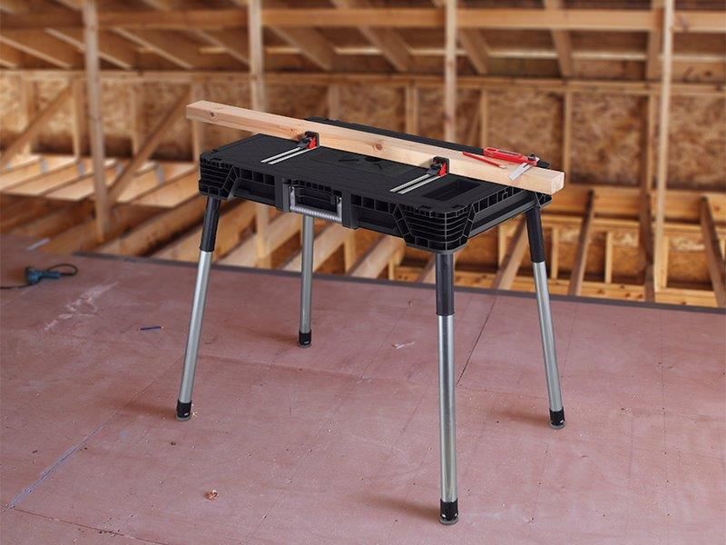 Dílenský stůl má působivou pracovní plochu 96 na 62 centimetrů. Stabilizátory na nohách zabraňují klouzání a vyrovnávají povrchové nerovnosti. Tento přenosný stůl váží pouze 8,7 kg a přitom nosnost činí 453 kilogramů. Součástí jsou čtyři svorky, univerzální kovové kolejnice ve tvaru T a organizér na nářadí.