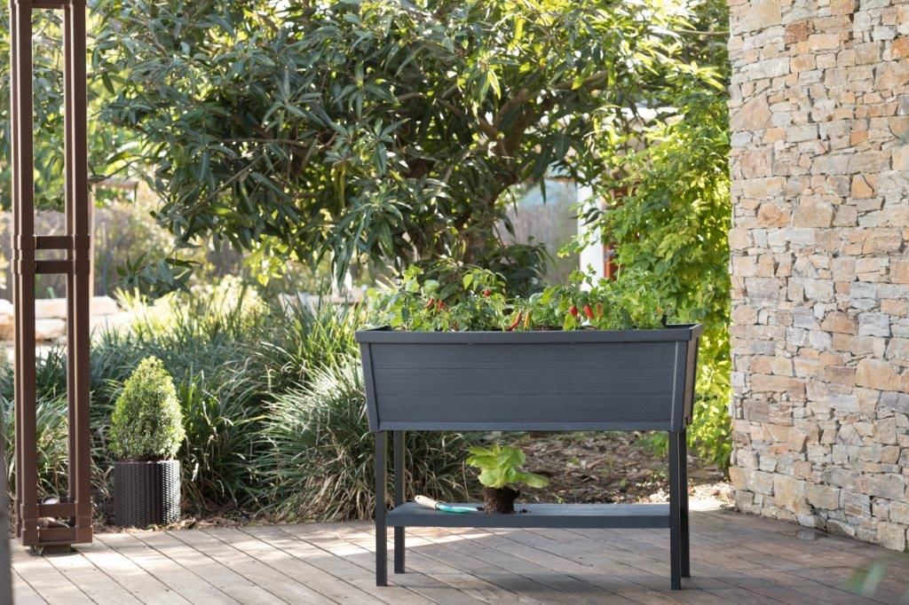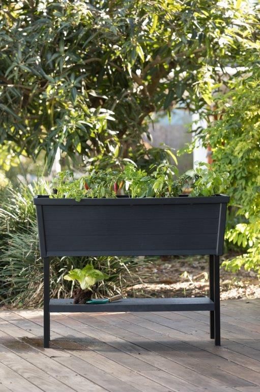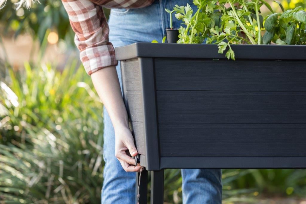 Elegantní truhlík Keter Alfresco se samozavlažovacím systémem stojí na vysokých kovových nohách a je praktickým pomocníkem pro pěstování květin, bylinek nebo třeba zeleniny. Nabízí kapacitu 110 l a jedná se tak o ideální doplněk do interiéru i exteriéru – vhodný do domácnosti, na terasu, na balkón nebo na letní zahrádky. Zaujme na první pohled moderním designem s imitací přírodního dřeva. Keter Afresco je vyroben z umělé polypropylenové pryskyřice, která je odolná vůči extrémním povětrnostním vlivům i slunečnímu záření a hravě odolá také rzi a hnilobě. Robustní a stabilní konstrukce květináče usnadní údržbu, kdy se u tohoto vyvýšeného truhlíku nebudete zbytečně ohýbat a naklánět, takže se hodí i pro starší generace, kterým již tolik neslouží jejich zdraví a bolí je záda a klouby. Předvýsadbové kontejnerky vám poslouží na malé sazeničky, ve kterých budou mít ideální podmínky pro svůj růst. Indikátor úrovně hladiny vody vás bude informovat o stavu zavlažování rostlin. Pomůže vám tak ochránit své drahocenné rostliny před přelitím, kdy přebytečnou vodu lze upustit vypouštěcím kohoutkem na boku truhlíku.
