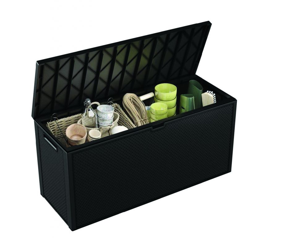Zahradní box Emily v grafitové barvě potěší svým jednoduchým a nenápadným vzhledem, který připomíná dřevěnou či ratanovou truhlu.