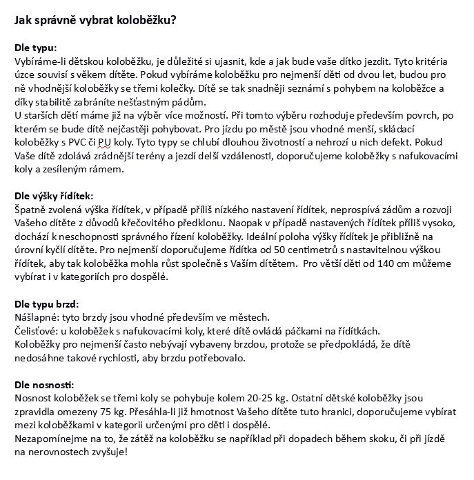 Zobrazit podrobnější popisKoloběžka pro děti i dospělé. Doporučené od 9 let, nosnost 90 kg.