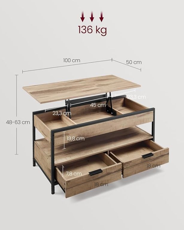 Stolek je vyroben z odolné dřevotřísky a ocelového rámu, což zajišťuje dlouhou životnost a stabilitu. Kvalitní kovové panty umožňují plynulé zvedání desky, která unese až 20 kg. Praktické úložné prostory, včetně skrytých přihrádek a zásuvek, udrží vše potřebné po ruce i skryté před zraky.