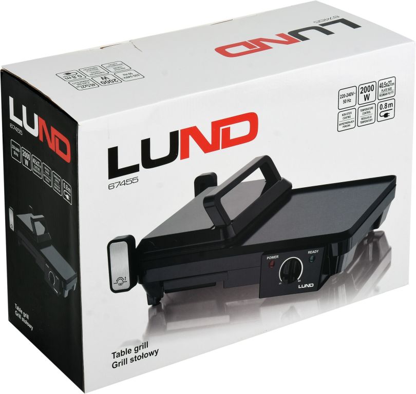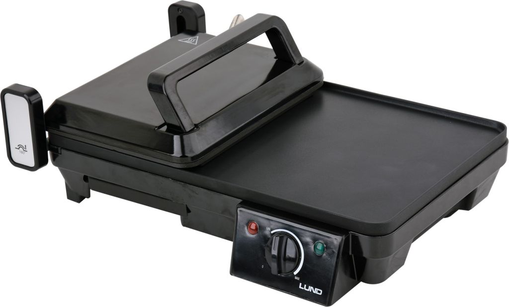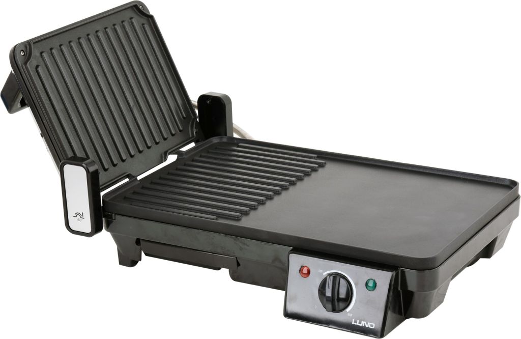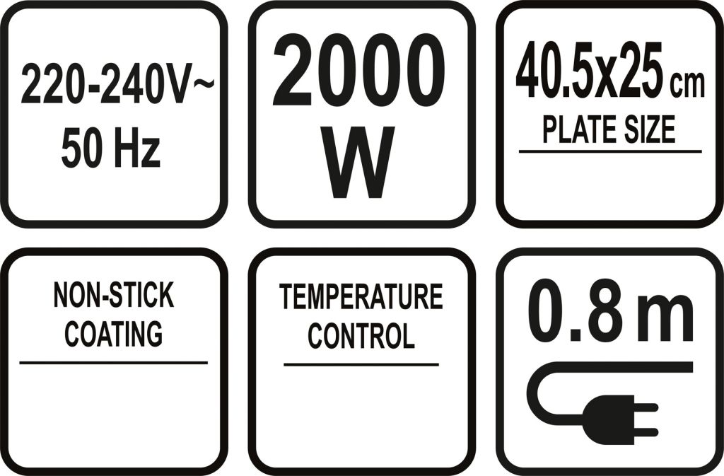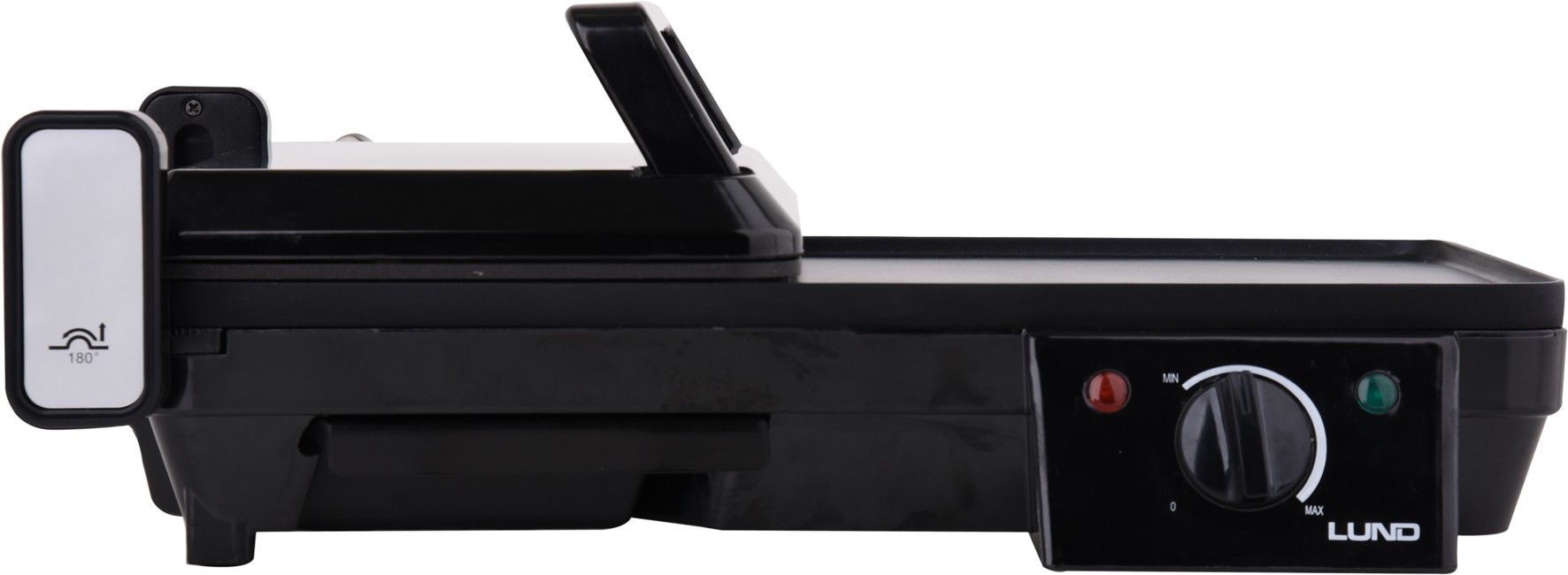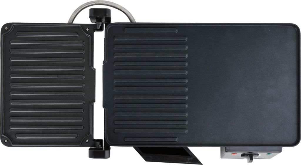 Tělo zařízení je vyrobeno z nerezové oceli a grilovací plocha z nepřilnavého, snadno čistitelného materiálu. Zařízení nabízí jak plochou, tak drážkovanou grilovací plochu. Grilovací plocha lze výškově nastavit a je opatřena vyvýšeným okrajem, takže je možné snadno udržet okolí grilu v čistotě. Regulovatelný příkon zařízení 2000 W zajistí rovnoměrné a rychlé grilování na hlavní (40,5 x 25 cm) a vedlejší výklopné ploše (18 x 24,5 cm). Napájení pomocí 230 V zajistí 0,8 m dlouhý kabel.