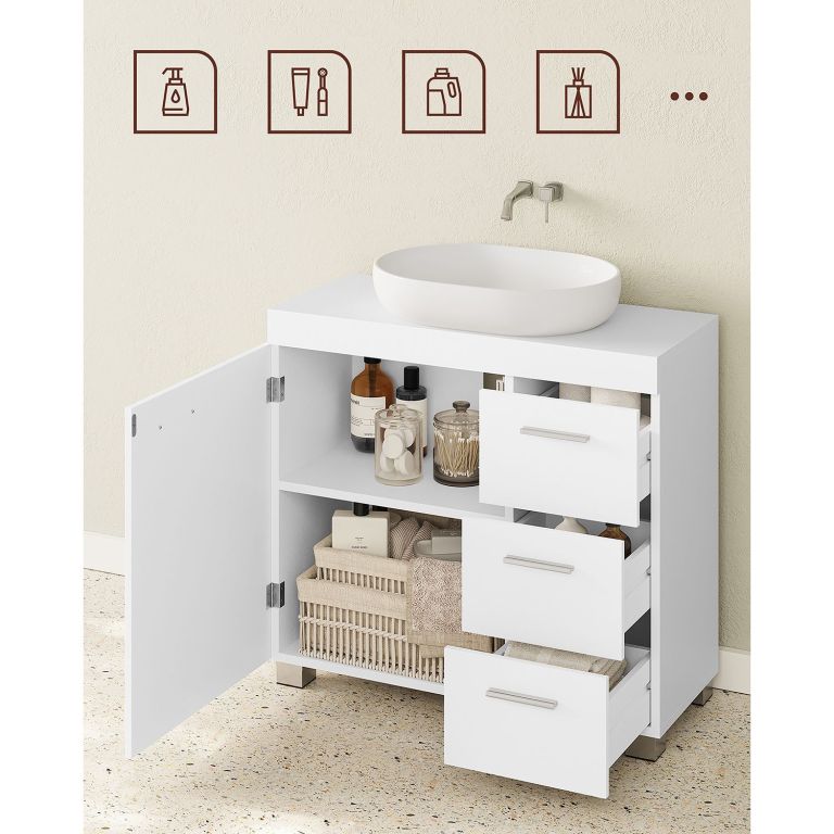 Praktická bílá skříňka pod umyvadlo s 3 zásuvkami a velkým úložným prostorem.