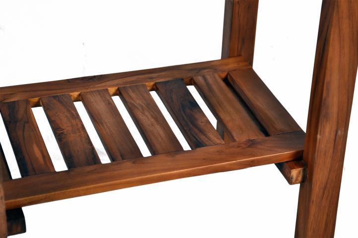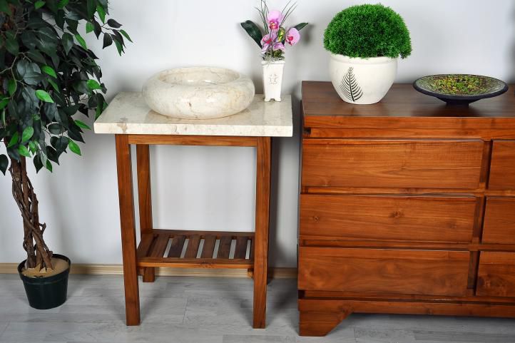 Díky tomuto nadčasovému a jednoduchému stolku získáte módní kus nábytku pod Vaše umyvadlo z přírodního kamene. Již si nebudete muset lámat hlavu jak umyvadlo v koupelně upevnit. Teakové dřevo je ideální variantou pro použit ve vlhkých prostorech, protože je odolný proti vlhkosti. Vrchní kamenná deska z bílého mramoru dodá celému stolkunádech luxusní elegance. Tento výjimečný kus nábytku udělá z Vaší koupelny wellnes oázu.