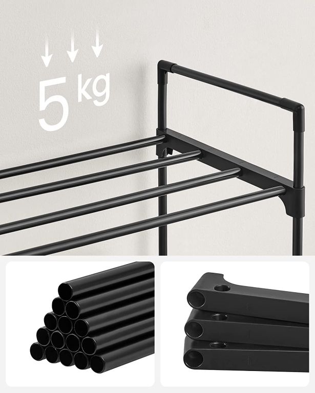 Vneste do svého domova pořádek a styl s tímto prostorným botníkem, který pojme až 15 párů dámských nebo 12 párů pánských bot. Elegantní černý design se hodí do každé předsíně, ložnice i šatny a pomůže vám udržet obuv přehledně uspořádanou a vždy po ruce.