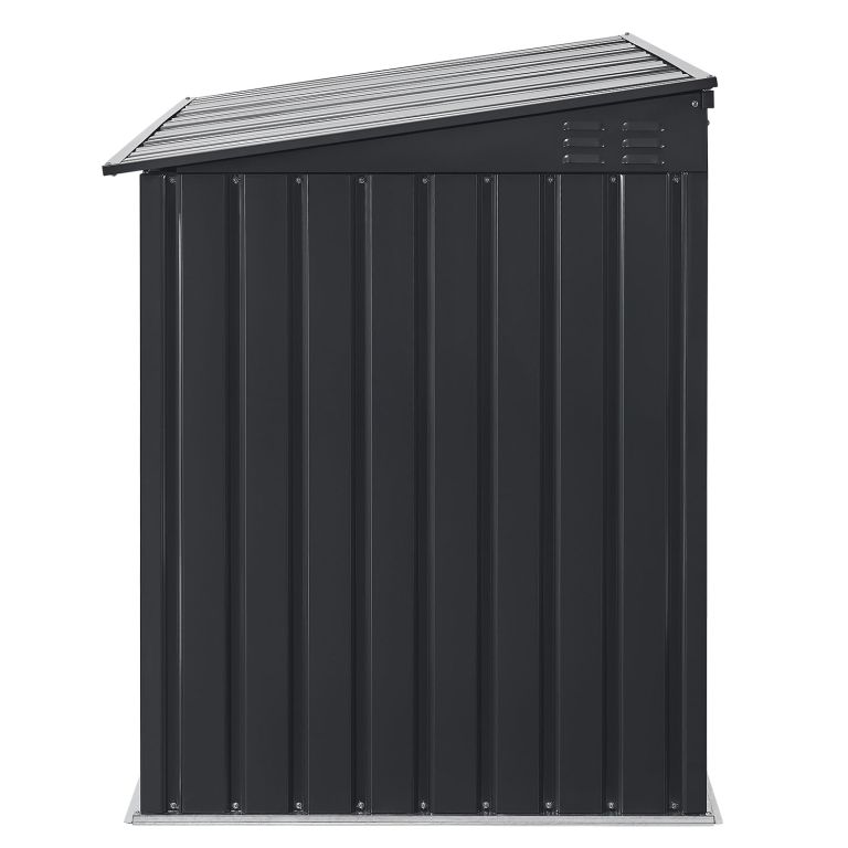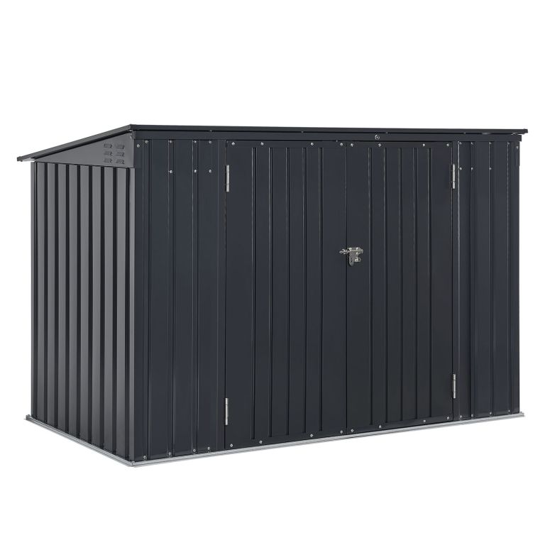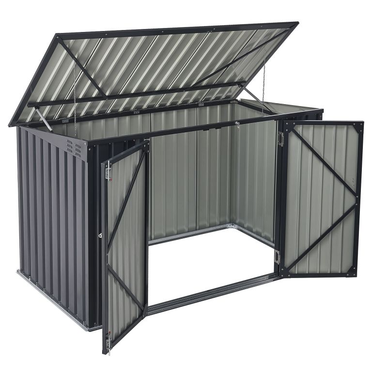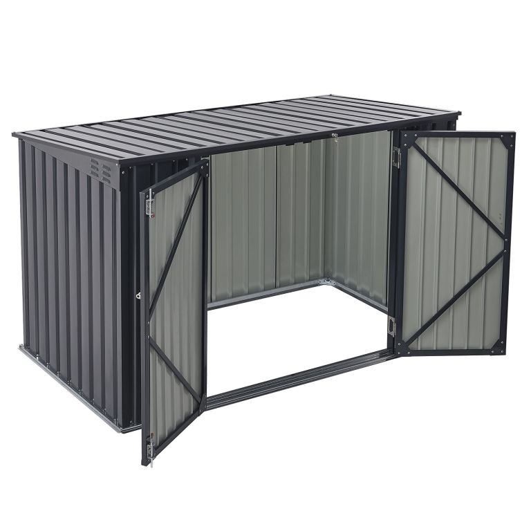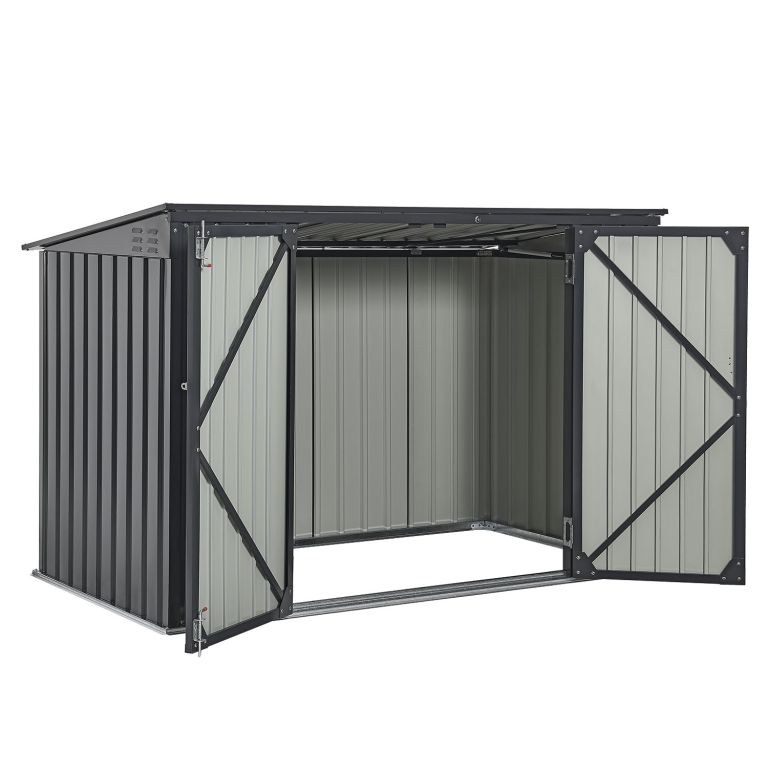Odolný kovový přístřešek s výklopnou střechou, zamykáním a velkými dveřmi pro pohodlný přístup vč. větracích štěrbin.