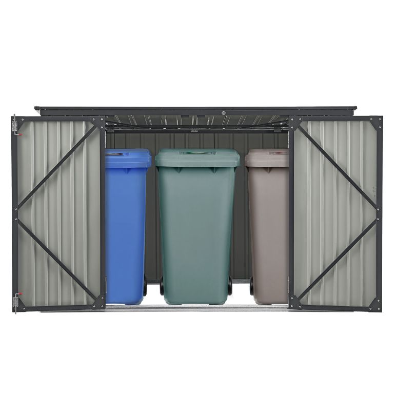 Hledáte praktický způsob, jak zakrýt popelnice a udržet okolí domu upravené? Box na popelnice Namur ukryje až tři nádoby a zároveň je ochrání před deštěm, větrem i nechtěnými pohledy. Výklopné víko se snadno otevírá díky plynové vzpěře a víko lze uzamknout. Dvoje široké dveře vpředu umožňují pohodlný přístup k nádobám i jejich manipulaci.