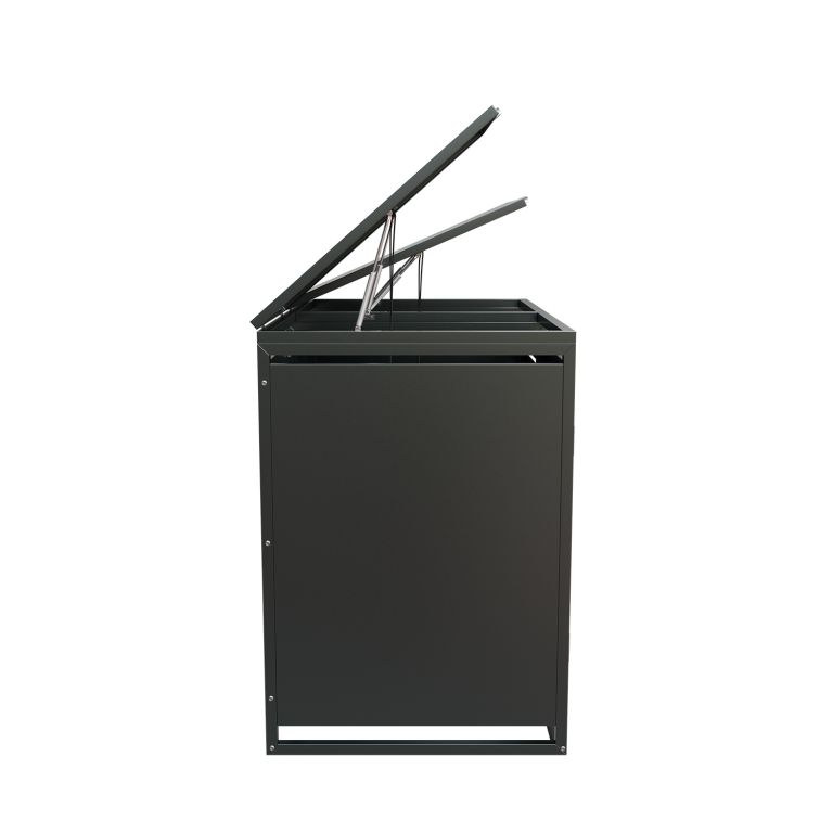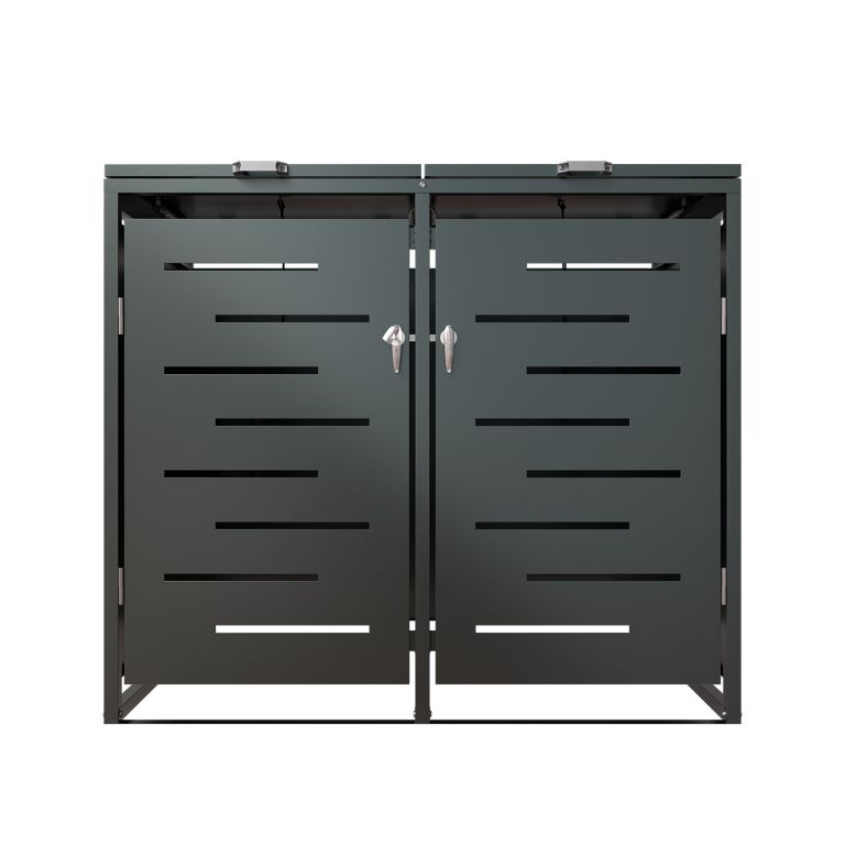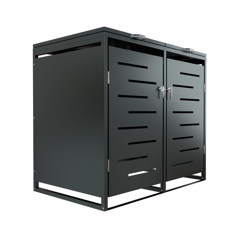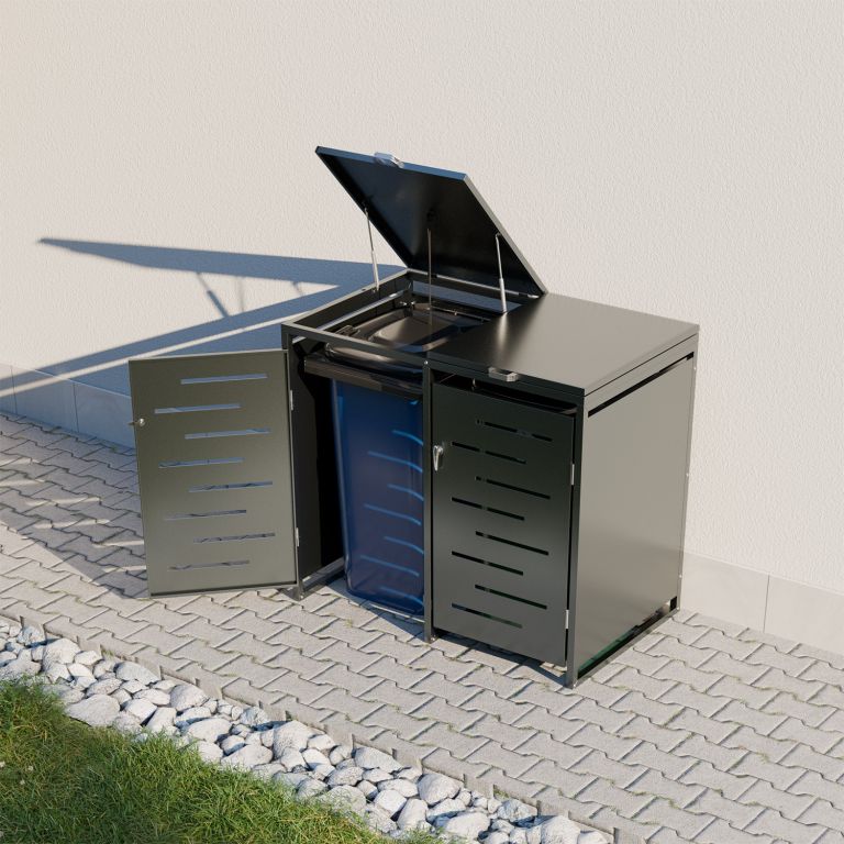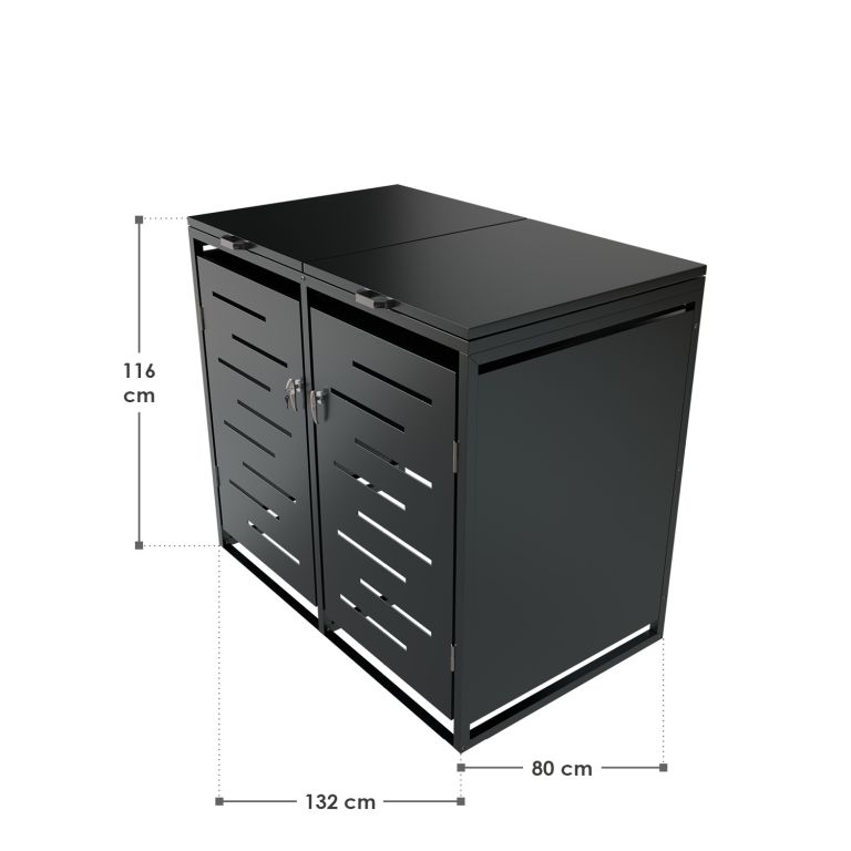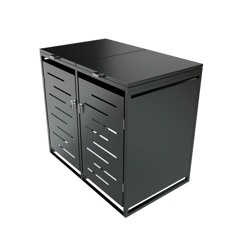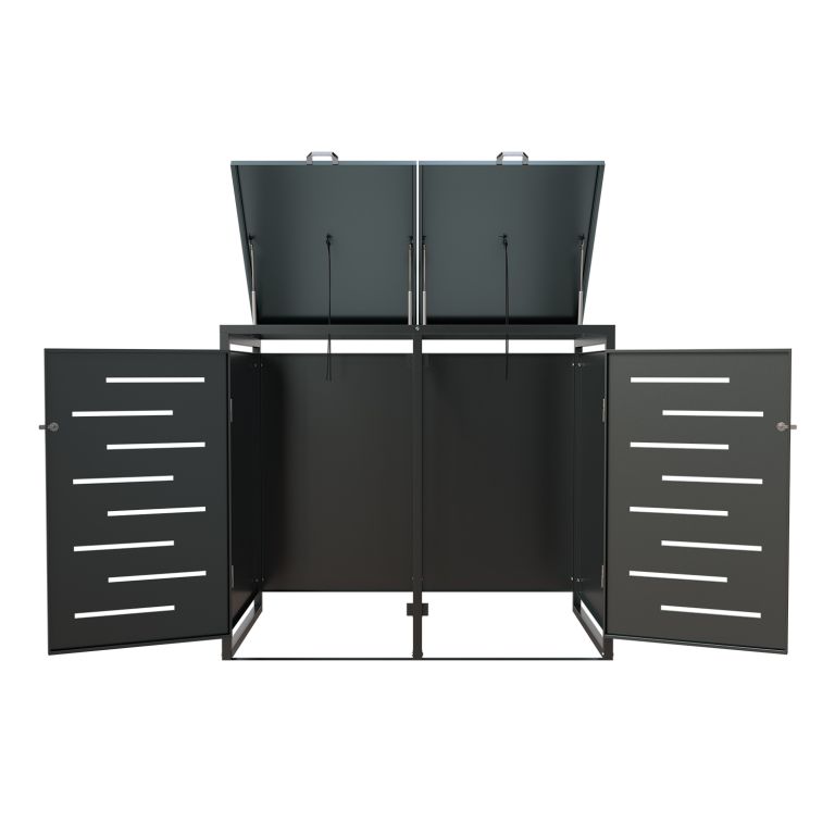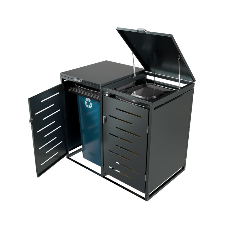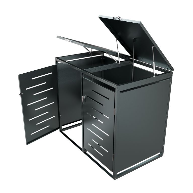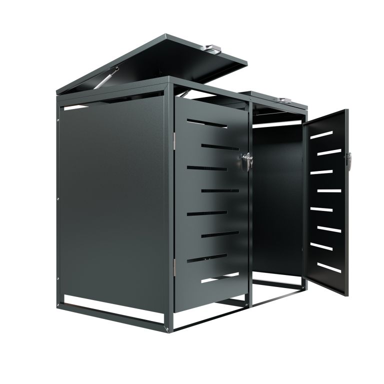 Konstrukce z pozinkované oceli zajišťuje vysokou odolnost vůči povětrnostním vlivům i snadnou údržbu. Horní víko s plynovou vzpěrou umožňuje jednoduchý přístup k nádobám o objemu 120–240 litrů. Přední dveře jsou vybavené zámkem, díky kterému máte jistotu, že k obsahu nebude mít přístup nikdo nepovolaný. Přístřešek je možné rozšířit o další modul pro 3 nebo 4 nádoby.
