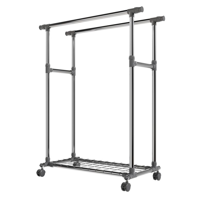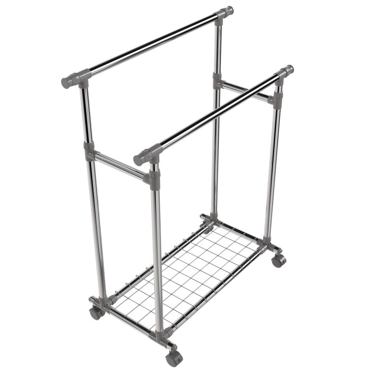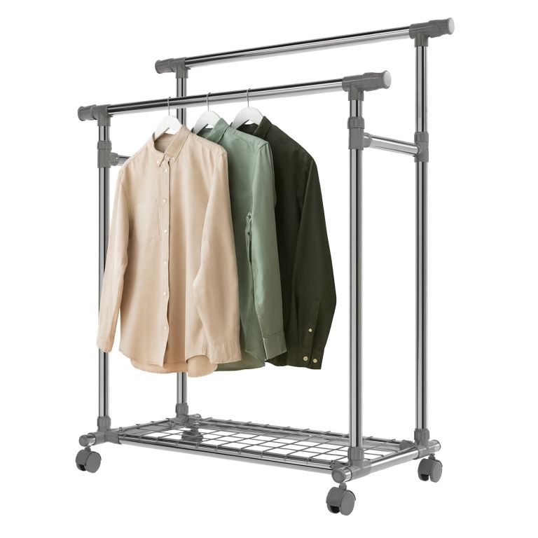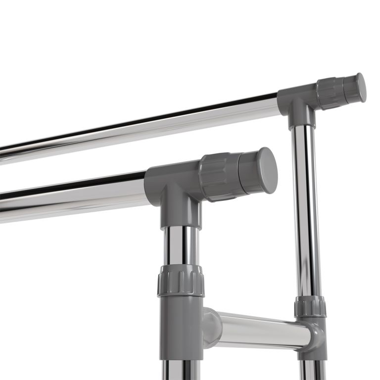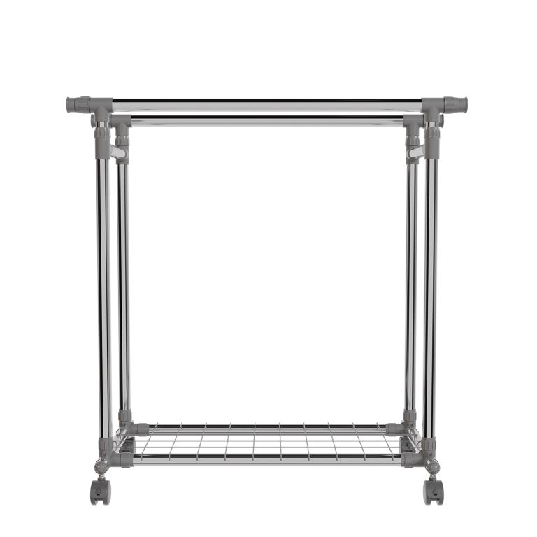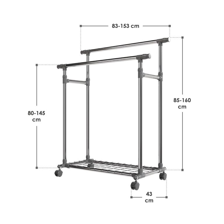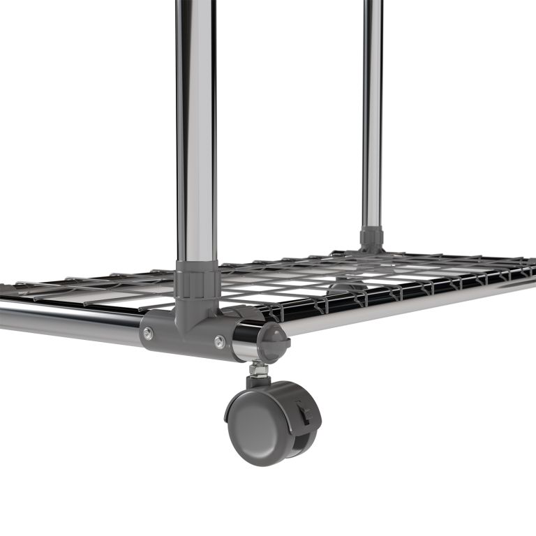 Stojan je lehký, přesto stabilní – pevné kovové trubky unesou až 17 kg na každé tyči a spodní police pojme další doplňky. Výsuvné boční části přidají prostor, když je potřeba, a kolečka zajistí snadné přemístění. Pokud rádi bydlíte prakticky a s lehkostí, tento mobilní stojan vám pomůže udržet pořádek i v menším prostoru.