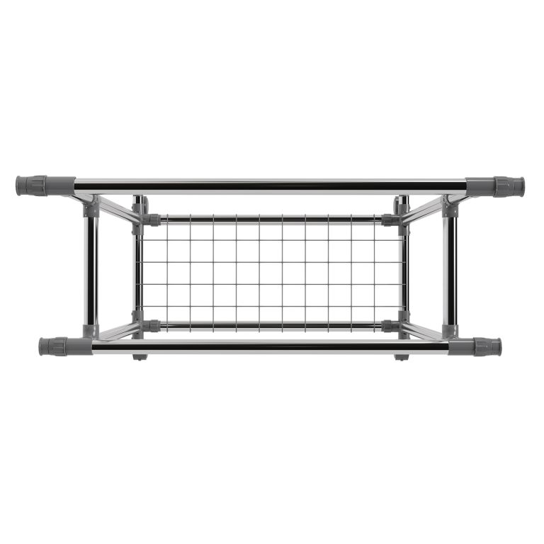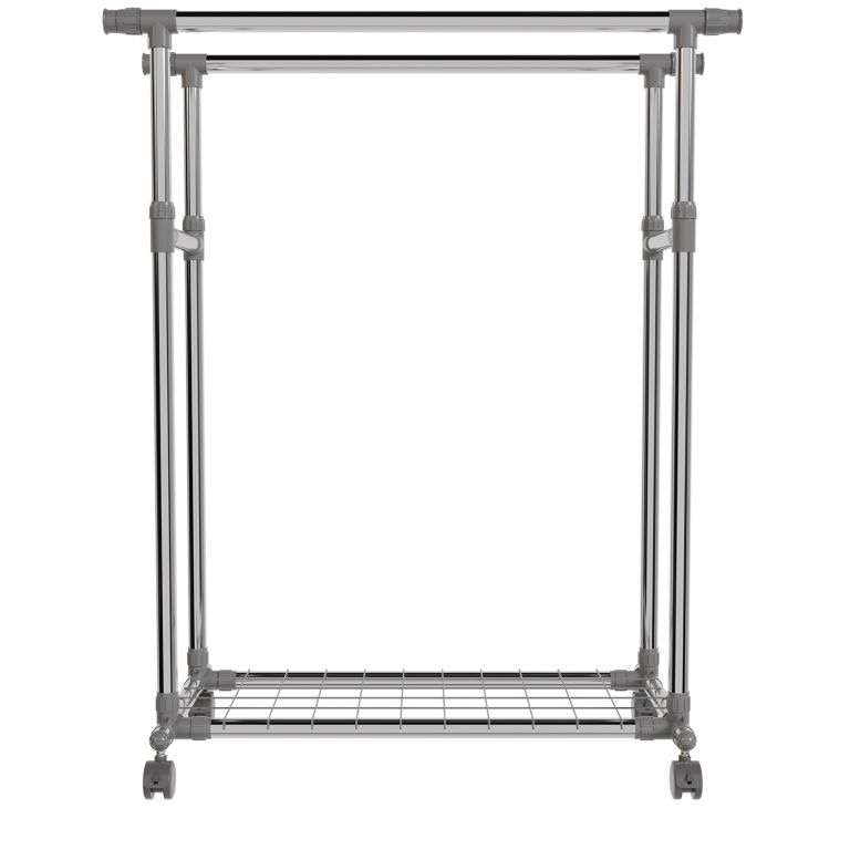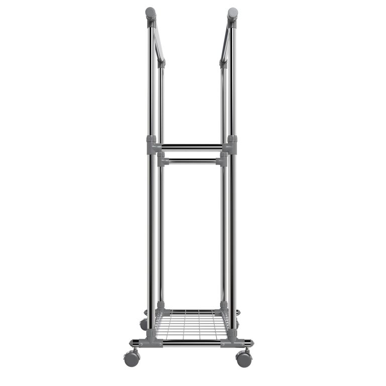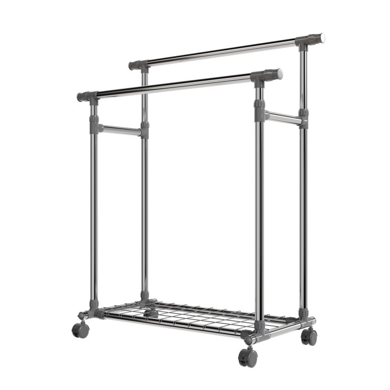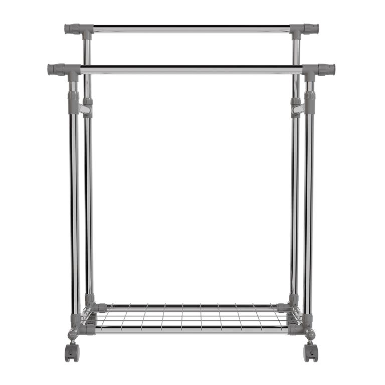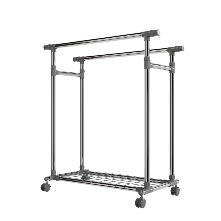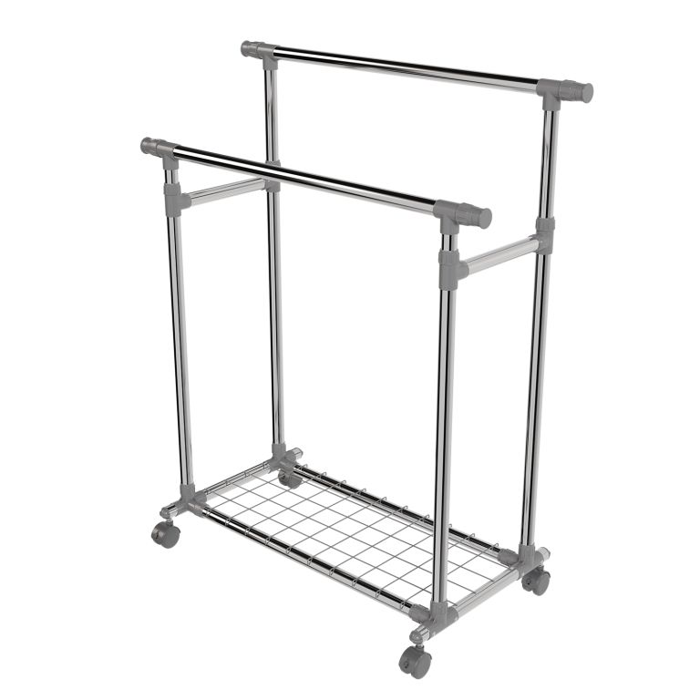Stojan je lehký, přesto stabilní – pevné kovové trubky unesou až 17 kg na každé tyči a spodní police pojme další doplňky. Výsuvné boční části přidají prostor, když je potřeba, a kolečka zajistí snadné přemístění. Pokud rádi bydlíte prakticky a s lehkostí, tento mobilní stojan vám pomůže udržet pořádek i v menším prostoru.