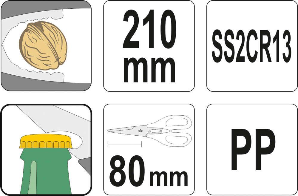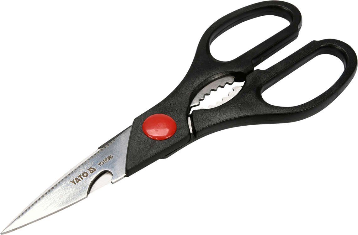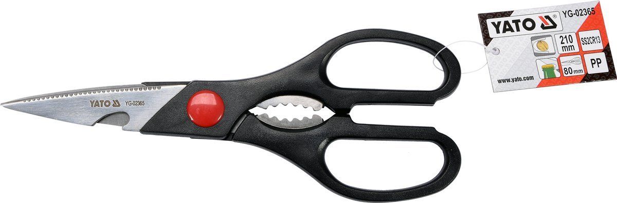 Nůžky YATO obsahují otvírák na láhve a louskáček na ořechy. Ergonomické rukojeti zvyšují pohodlí práce. Jsou také určeny k použití leváky.