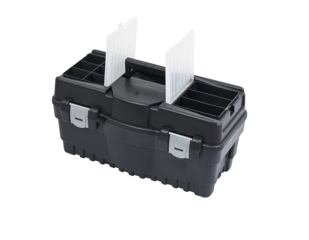 Prostorný univerzální kufr na nářadí s praktickým odnímatelným platem. Kufr disponuje organizérem na víku pro umístění například šroubů či matic z průhledného plastu, takže na tyto drobné předměty vidíte.
