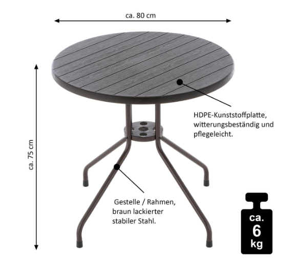 Stůl má pevnou ocelovou konstrukci s hnědým nátěrem a odolnou plastovou deskou o průměru 80 cm. Výška 75 cm je ideální k běžným zahradním židlím. Nohy o průměru 25 mm zajišťují stabilitu, hmotnost 6 kg umožňuje snadnou manipulaci. Materiály jsou odolné vůči povětrnostním vlivům a snadno se čistí, takže stůl zvládne celoroční venkovní použití.