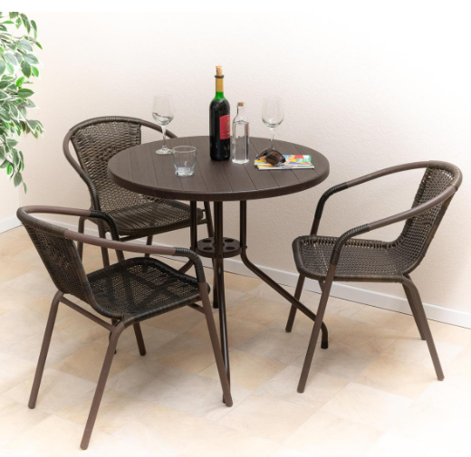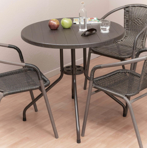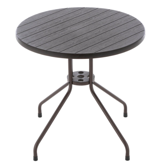 Stylový bistro stůl 80 cm v hnědém dekoru dřeva. Skvělý pro snídaně, večeře či setkání na zahradě nebo terase.