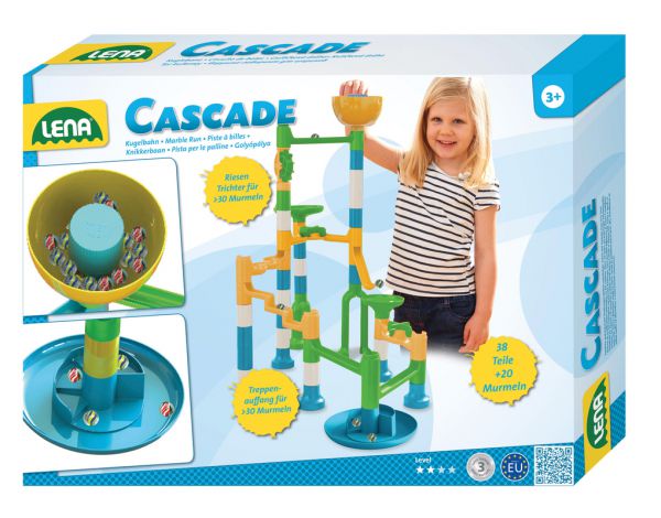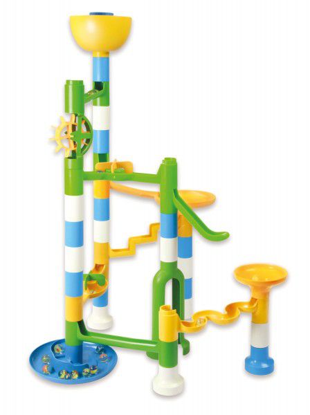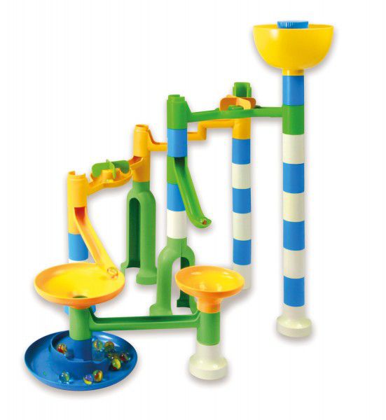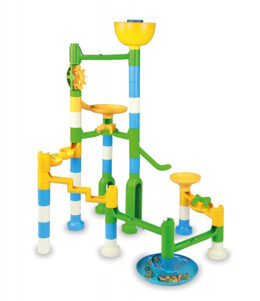 Barevná, plastová kuličková dráha obsahující 39 různě sestavitelných dílků, 20 kuliček a XL násypku na kuličky.V krabici 40x30x8 cm.Vhodné od 3 let.