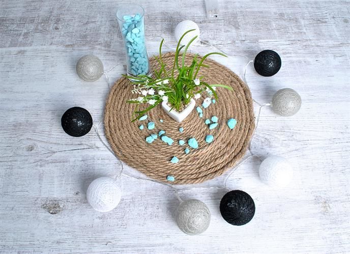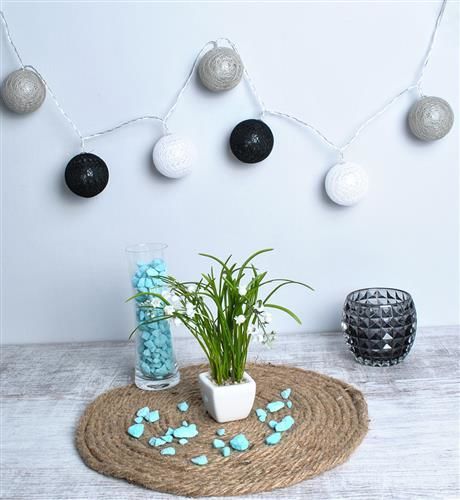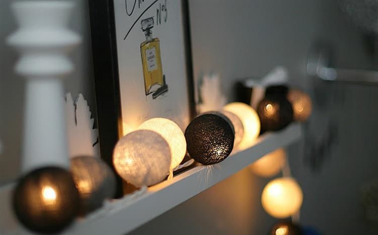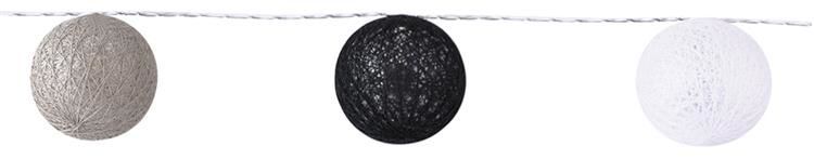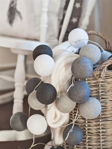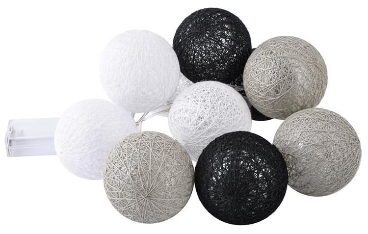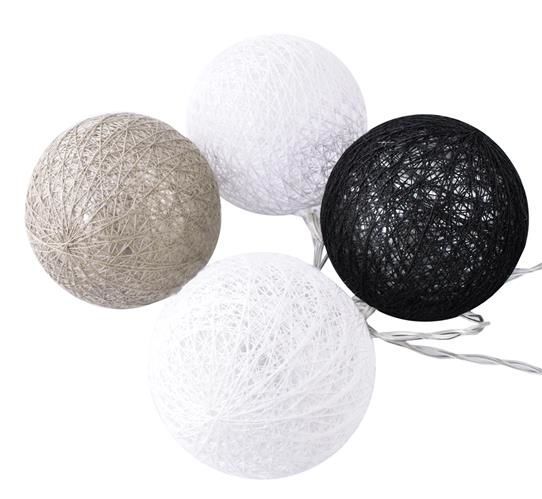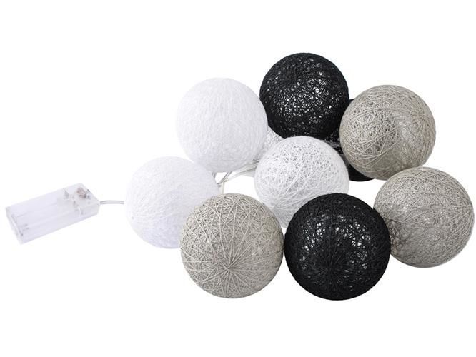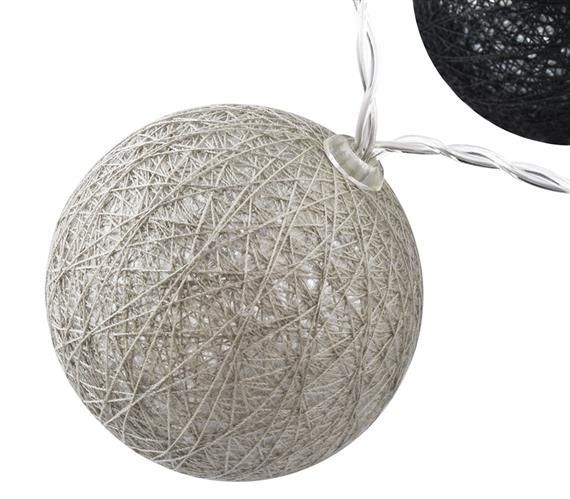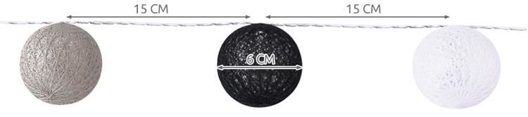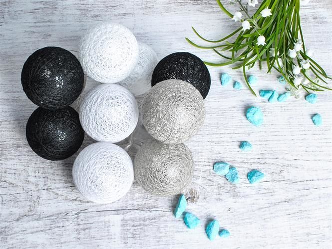 Dekorativní koule jsou z bavlněné příze, umístěné na průhledném kabelu a napájené dvěma bateriemi AA, takže nepotřebujete elektrickou zásuvku.