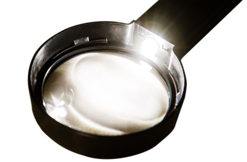 Černá ruční lupa, zvětšení 3x nebo s přídavnou čočkou 6x, světlo se spínačem na rukojeti, průměr čočky 90 mm, přídavná čočka 21 mm, optický plast.
