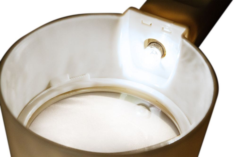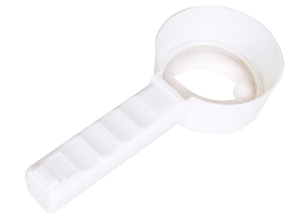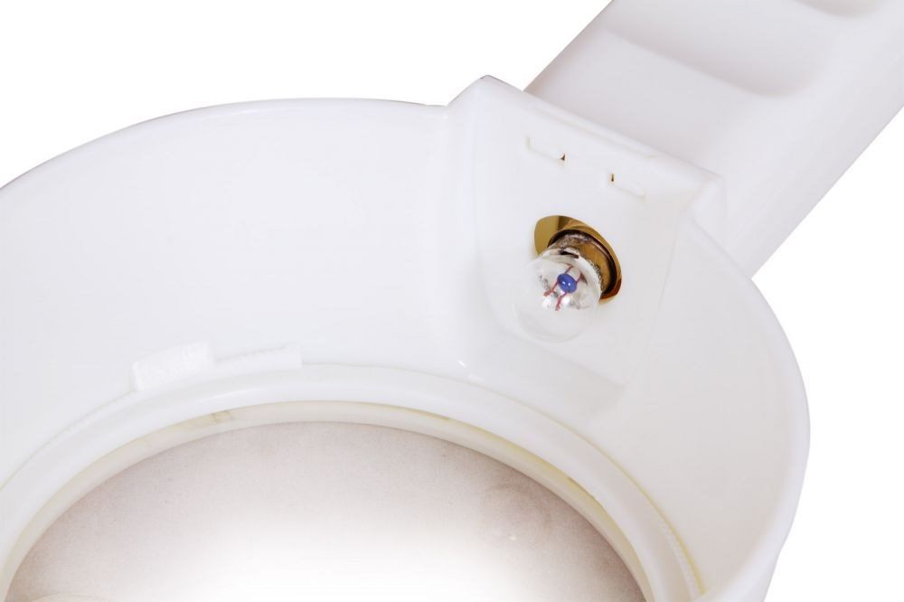 Bílá ruční lupa, zvětšení 2x nebo s přídavnou čočkou 6x, světlo se spínačem na rukojeti, rozměry čočky 80 x 80 mm, přídavná čočka 20 mm, optický plast