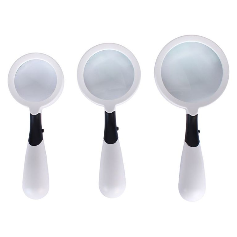 Sada ručních lup obsahuje 3 lupy odlišených průměrů s přiblížením 2, 3 a 4 násobným. Nainstalované LED osvětlení snadno zapnete pomocí spínače.