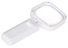 Bílá ruční lupa, zvětšení 2x nebo s přídavnou čočkou 6x, světlo se spínačem na rukojeti, rozměry čočky 80 x 80 mm, přídavná čočka 20 mm, optický plast