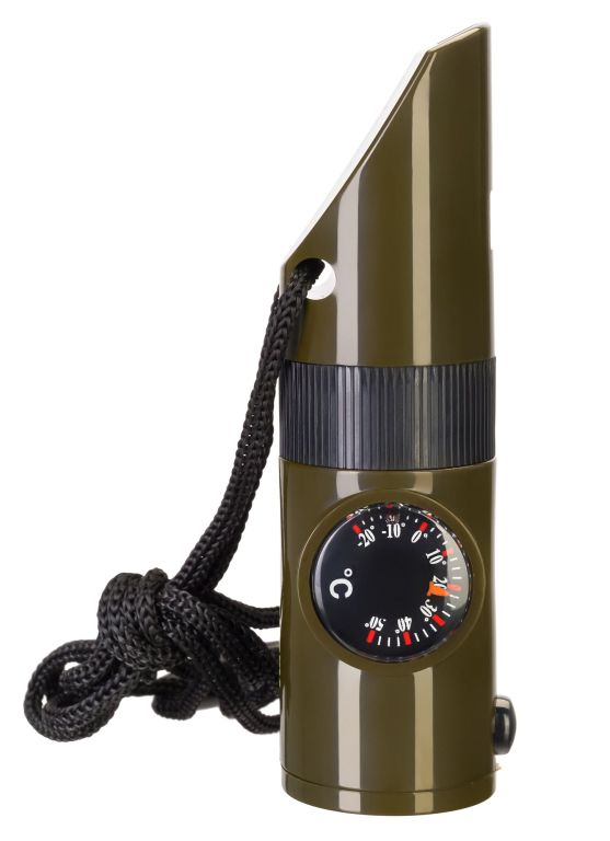 Všechna tato zařízení jsou sestavena do kompaktního vícedílného nástroje, který tak můžete nosit neustále při sobě. Kompas a teploměr se nachází po stranách, píšťalka a svítilna jsou umístěny na koncích zařízení a po rozdělení vícedílné konstrukce získáte praktickou lupu a malé zrcátko. Tlačítko pro zapnutí svítilny je umístěno na vrchní straně přístroje a o její napájení se stará 3V lithiové knoflíkové baterie CR1220, kterou v případě vybití snadno vyměníte za jinou.