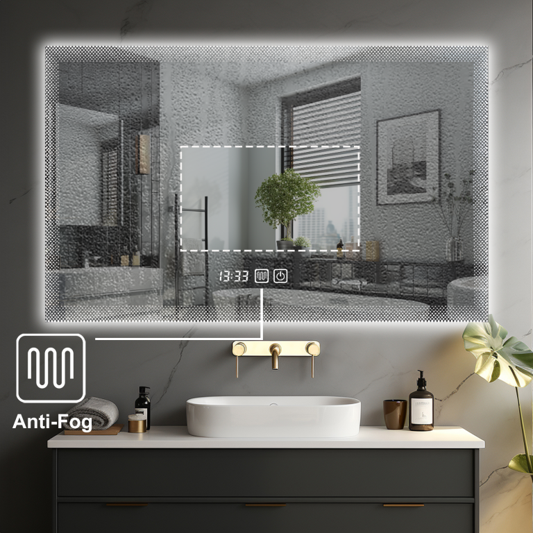 Funkčně je vše postavené na jednoduchém dotykovém ovládání: krátkým stiskem přepínáte barvu světla (studená → neutrální → teplá), dlouhým stiskem plynule regulujete jas. Nechybí odmlžování, krytí IP44, napájení 220–240 V / 50–60 Hz se zástrčkou VDE a kabel cca 1,5 m. Zrcadlo je z 5mm skla bez mědi a bez olova, po montáži je odsazené od zdi o 3 cm; LED mají 120 diod na 1 m, životnost 50 000 hodin a energetickou třídu A++.