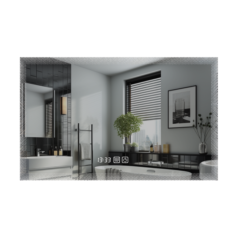 Stylové LED zrcadlo 90×70 s hodinami a přepínáním na teplotu v místnosti. 3 barvy světla, stmívání a odmlžování.