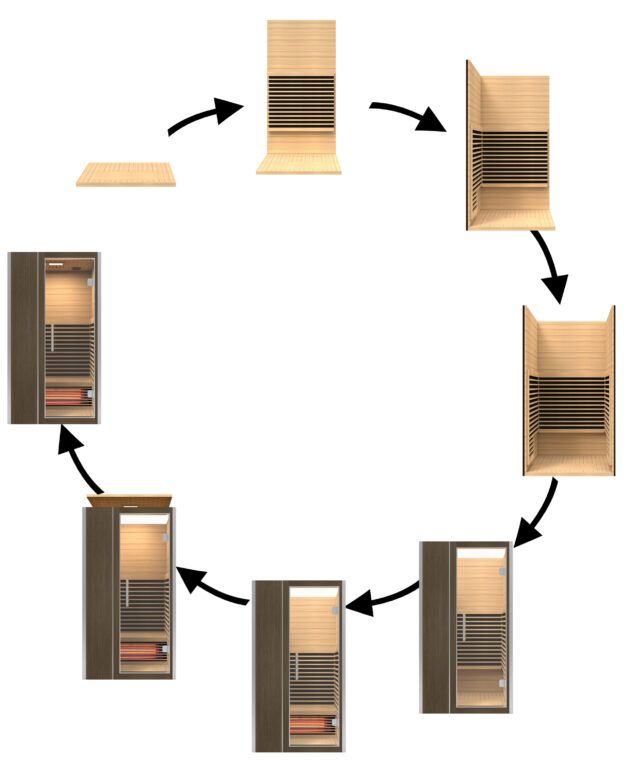 Montáž infrasauny je rychlá a jednoduchá. K přichycení jednotlivých částí se používají kufrové spony, čepy nebo klasické šrouby. Elektroinstalace je již namontovaná od výrobce, pouze stačí propojit kabeláž pomocí zásuvek a konektorů. Vše je přehledně označené.