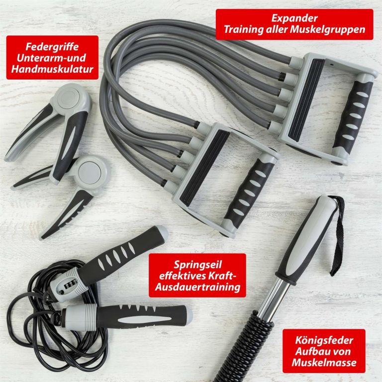 Expandér/elastický pás je určen pro všestranný trénink všech svalových skupin vašeho těla. Zejména horní část těla se s ním dá tvarovat. V závislosti na úrovni trénovanosti si můžete individuálně nastavit napětí. Trenažér pružinových úchopů rukou trénuje svaly předloktí a rukou. Zlepšují sílu úchopu rukou a prstů, vytrvalost, pružnost, svalový tonus a jemnou i hrubou motoriku. Švihadlo je vybaveno kuličkovým ložiskem, které usnadňuje jeho otáčení a houpání. Integrováno je také počítadlo, ergonomické rukojeti lana poskytují pohodlný pocit a neklouzavý úchop. Vysoce kvalitní královská pružinová/ohýbací činka nabízí působení síly pomocí pružiny z uhlíkové oceli, která se individuálně přizpůsobuje námaze, a tím maximálně lechtá - ideální pro budování svalové hmoty. Zde se procvičuje celá horní část těla, tj. paže, krk a ramena, hrudník, tricepsy, bicepsy a prsní svaly.
