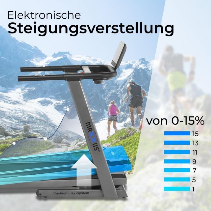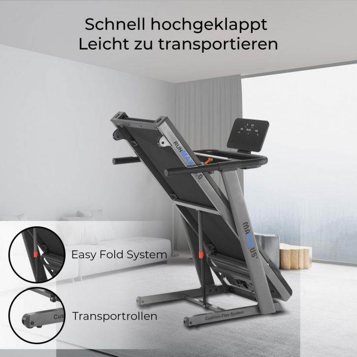 Běžecký pás MAXXUS RunMaxx 5.0 byl navržen s ohledem na stabilitu a robustnost. Ve složeném stavu tento systém zajišťuje jízdní plochu a pevný stojan. Vysoce výkonný stejnosměrný motor modelu RunMaxx 5.0 kombinuje výkon s moderní elektronikou. Digitální řídicí jednotka trvale ovládá a reguluje motor. Výsledkem je dokonalý přenos výkonu z motoru na pojezdovou jednotku. Tréninkové jednotky se sklonem jsou ideální pro zlepšení běžecké výkonnosti, posílení svalů nohou, zejména lýtkových a nastavení nových zátěžových podnětů.
