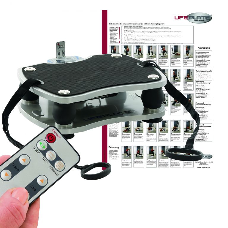 Sami se rozhodněte, jak efektivní chcete, aby váš trénink byl. Kromě možnosti nastavení vibrací lze zvolit dvoustupňový zdvih desky (měkký/silný). Tímto způsobem lze v poloze Strong ještě více zesílit nastavené vibrace. Dva displeje zobrazují tréninková data snadno čitelným způsobem. Displeje LED jsou dobře čitelné i v tmavších místnostech. Kromě možnosti ovládat LifePlate 1.0 manuálně, tj. nastavit rychlost vibrací a dobu tréninku i samotný zdvih desky, byly do přístroje implementovány tři pevné předprogramované programy. Ty automaticky mění rychlost vibrací. V manuálním programu si uživatel nastaví intenzitu, zdvih desky a dobu trvání cvičení pro každý jednotlivý cvik. LifePlate 1.0 má čtyři kryté pružicí prvky, které jsou přesně vyladěny tak, aby poskytovaly potřebné tlumení a je vhodný i pro použití v bytě. Proto mají vibrace na tréninkové ploše tak silný a příjemný účinek. Aby byl kontakt při cvičení horní části těla co nejpohodlnější, má LifePlate 1.0 měkkou tréninkovou podložku přilepenou k tréninkové desce, která poskytuje optimální oporu. I bez obuvi je možné provádět např. uvolňovací cviky pro nohy. LifePlate 1.0 je vybaven motorem s přímým pohonem speciálně navrženým pro vibrační desky. Tím se generují vibrace přímo pod tréninkovou deskou. Motor pracuje bez zatížení, a proto nemůže být při použití v souladu se svým určením nikdy přetížen.