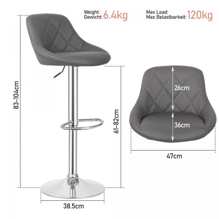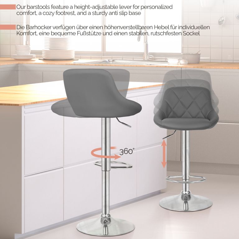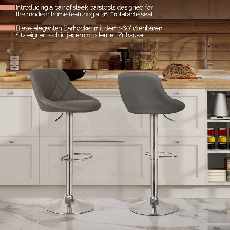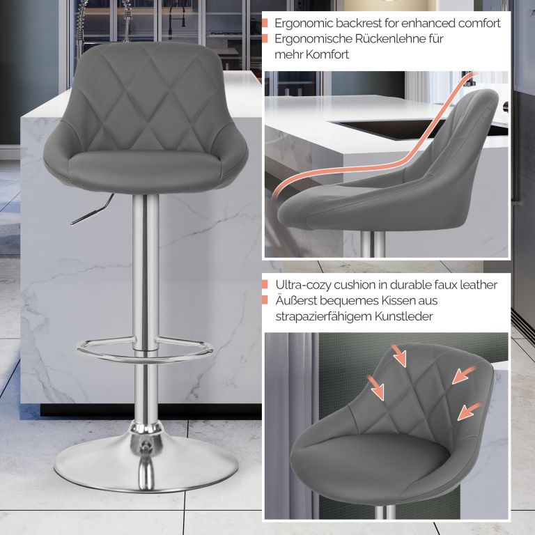 Proměňte svůj prostor pomocí těchto elegantních barových stoliček, které se skvěle hodí do kuchyně, baru nebo kanceláře. Díky výškově nastavitelnému mechanismu jsou flexibilní pro všechny výšky pultu, zatímco chromovaný ocelový rám a zaoblená 38,5 cm vysoká základna zajišťují robustnost a stabilitu. Sedáky jsou čalouněné snadno udržovatelnou imitací kůže a nabízejí maximální pohodlí díky velkorysému pěnovému polstrování o tloušťce 5 cm. Díky působivé nosnosti 120 kg jsou tyto stoličky vhodné pro širokou škálu uživatelů. Každá sada se skládá ze dvou barových stoliček s otočným sedákem o 360°, integrovanou opěrkou nohou, nastavitelnou plynovou pružinou a robustní deskou pro podepření základny.