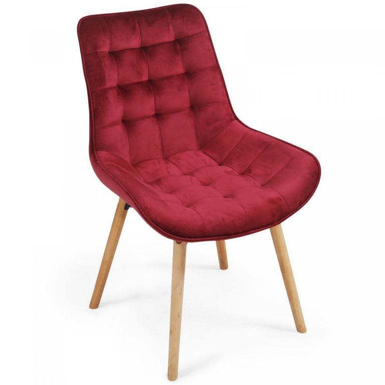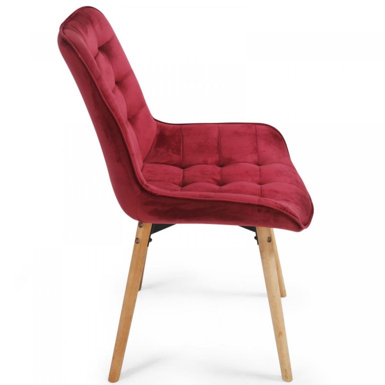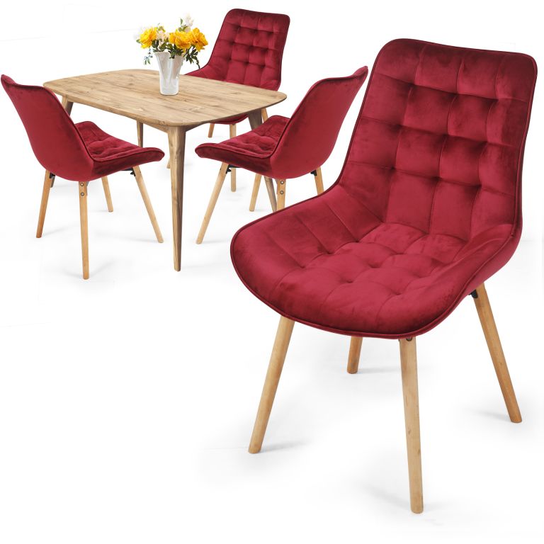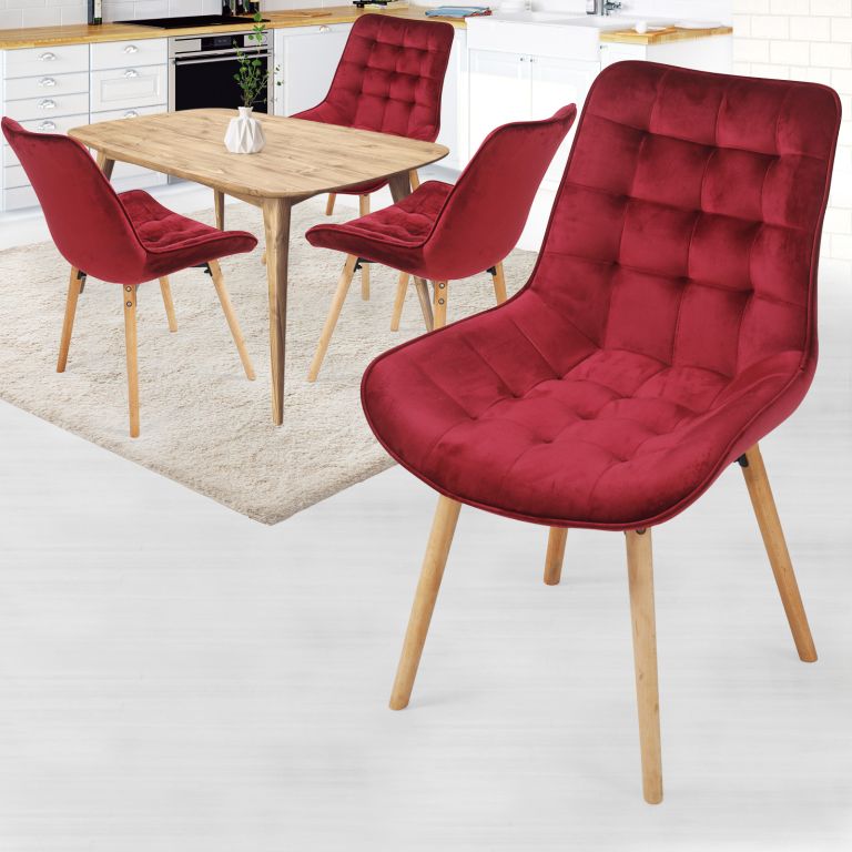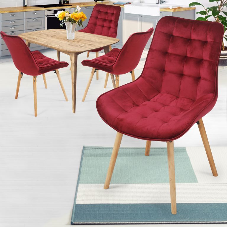 Sametové židle do jídelny v tmavě červené barvě promění každé stolování v nezapomenutelný zážitek. Protiskluzové nohy jsou vyrobeny z bukového dřeva.