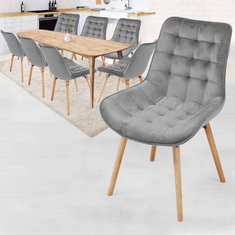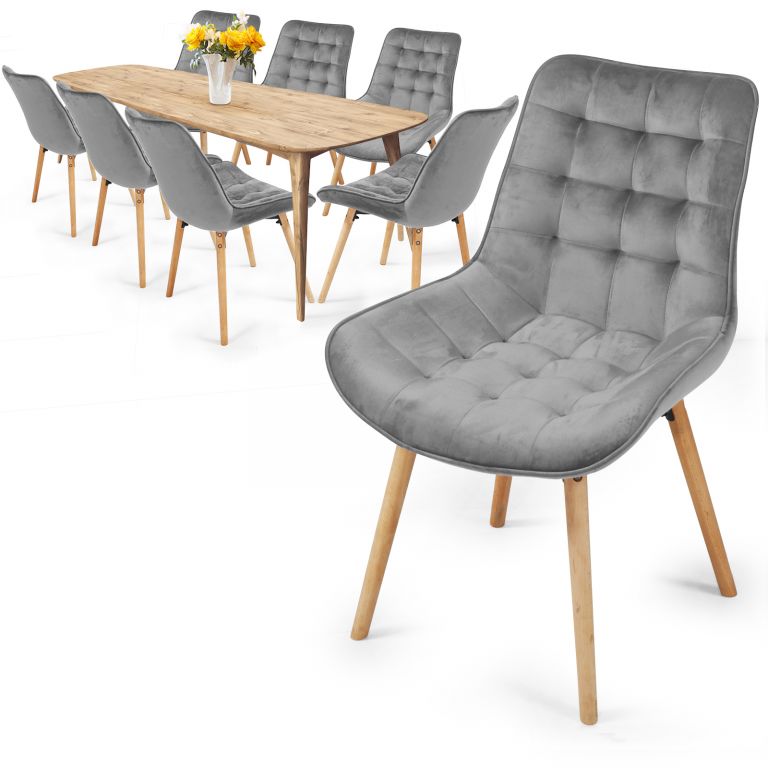 Tyto sametové židle do jídelny promění každé stolování v nezapomenutelný zážitek. Protiskluzové nohy jsou vyrobeny z bukového dřeva.