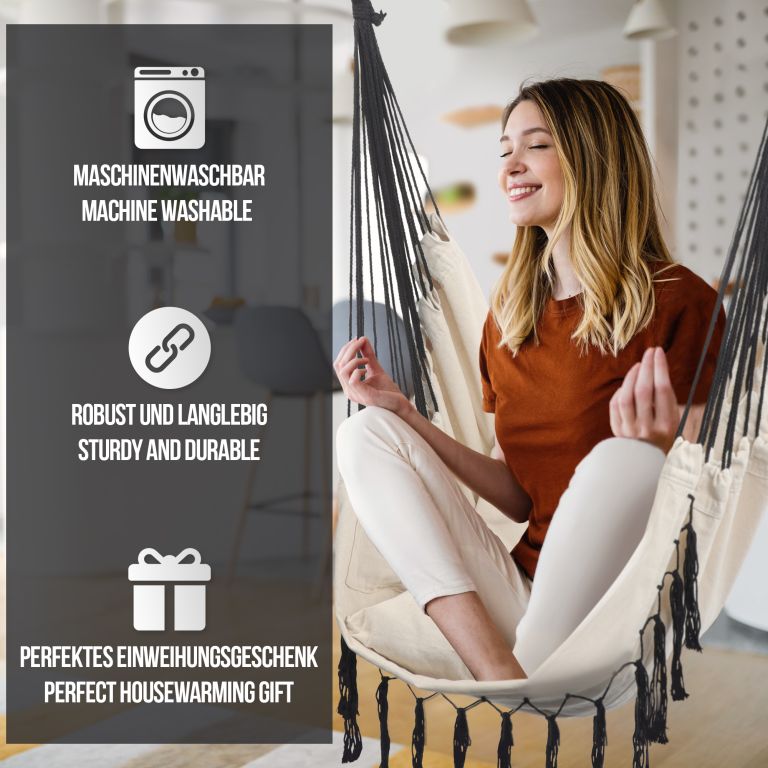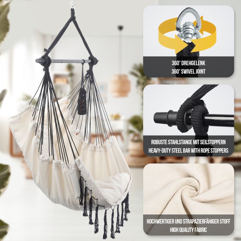 Toto visací křeslo je vyrobeno z odolné směsi bavlny a polyesteru a má odnímatelné potahy na polštáře, které lze jednoduše vyprat v pračce. Údržba tohoto visacího křesla je opravdu hračkou. Tato visací židle je upevněna na ocelové rozevírací tyči, díky 360° otočnému kloubu si snadno najdete pohodlnou sedací pozici a užijete si maximální komfort. Navzdory svému pohodlnému designu je toto visací křeslo vyrobeno z odolného materiálu, který odolává každodennímu opotřebení a poskytuje dlouhou životnost.