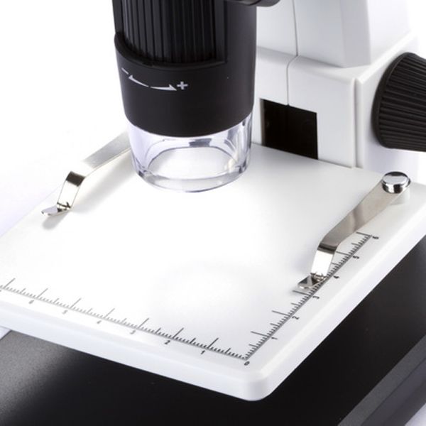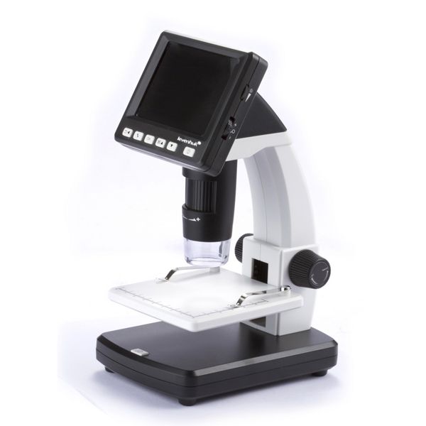 Digitální mikroskop s vestavěným LCD displejem vám umožňuje studovat preparáty a výsledky své práce ukládat v obrazovém nebo video formátu na kartu microSD. Osm vestavěných LED žárovek rovnoměrně osvětluje pracovní plochu a zajišťuje minimální spotřebu energie - osvětlovací systém je vybaven regulací jasu. Stolek tohoto mikroskopu je vybaven měřicí stupnicí (8 cm podél osy x, 6 cm podél osy y) a dvěma úchyty k upevnění preparátu pod fotoaparátem. Barevný 3,5" LCD displej tohoto mikroskopu je vybaven tlačítky rychlého přístupu, která vám umožňují snadno nastavit jas, expozici a vyvážení barev.