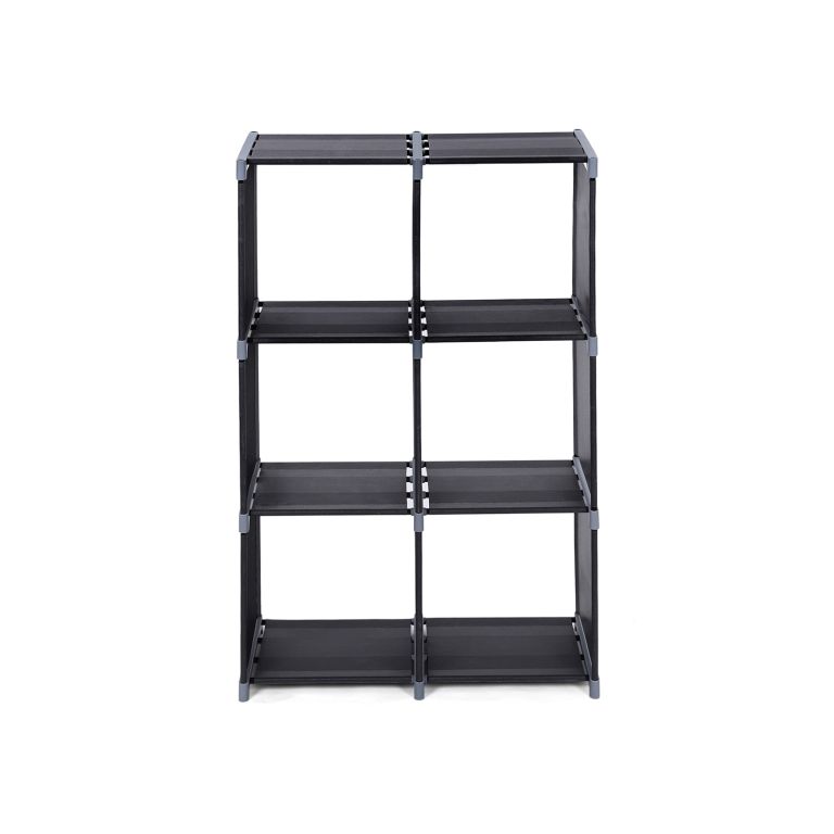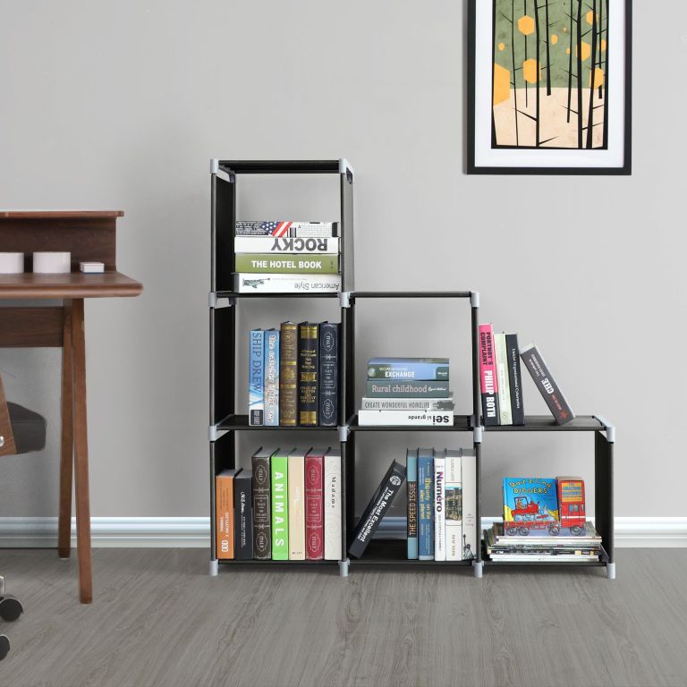 Lehký regál s 6 kostkami a kovovým rámem. Snadná montáž bez nářadí, variabilní tvarování a stabilní nosnost.